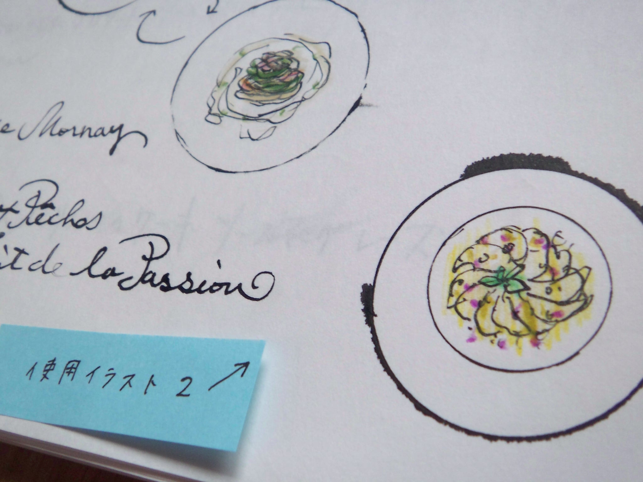 ある月のディナー,フランス語と日本語併記。ペンで線書きして色鉛筆で着色。