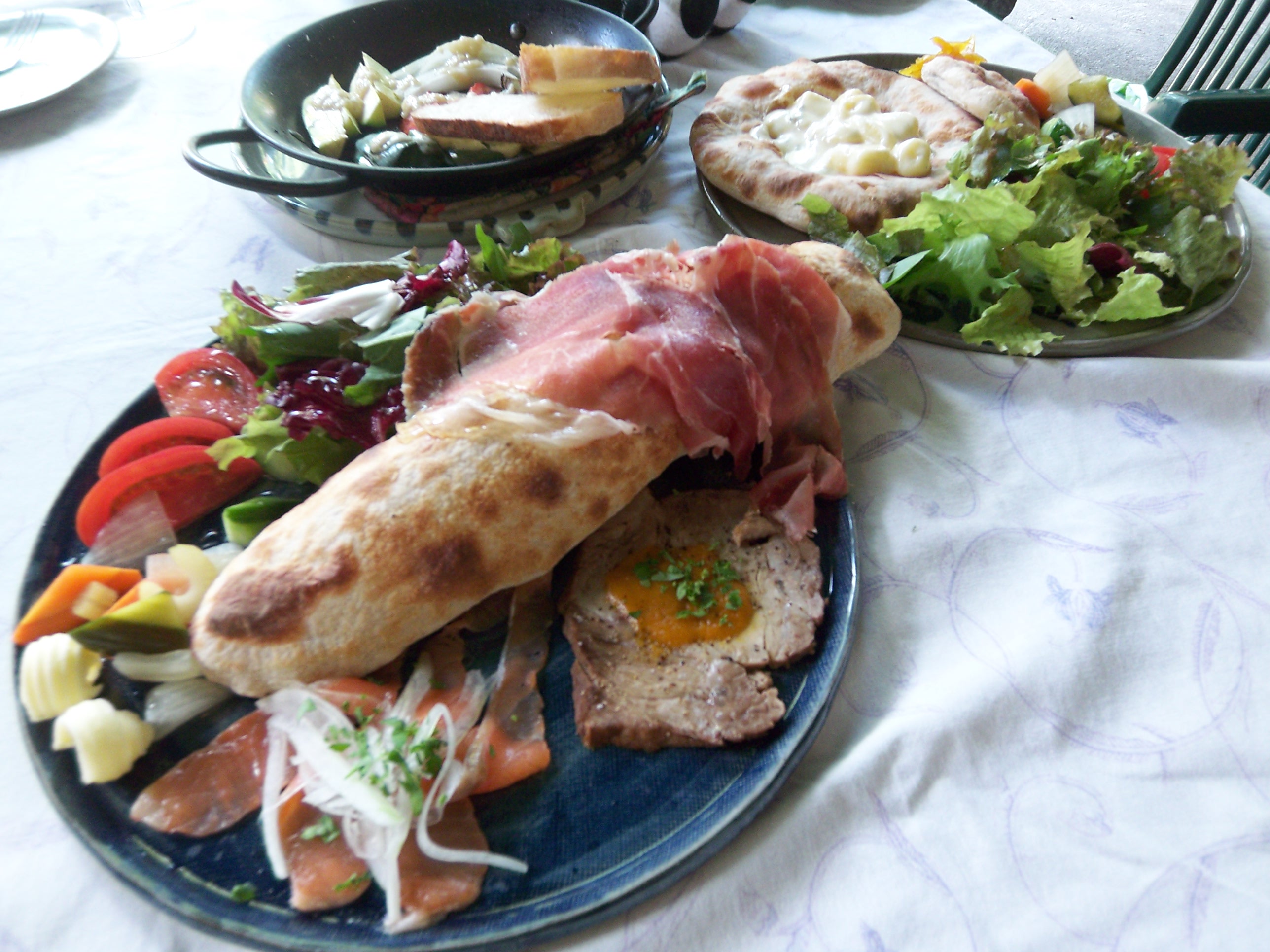 ピザ生地を焼いたアッソパンが名物。手前はアッソパンミスト,生ハムや前菜類とともに頂く。右はパンの中がくりぬかれチーズニョッキが入っている、パンにソースを絡めながら頂く。左奥は窯焼き野菜。何を食べても美味い!。