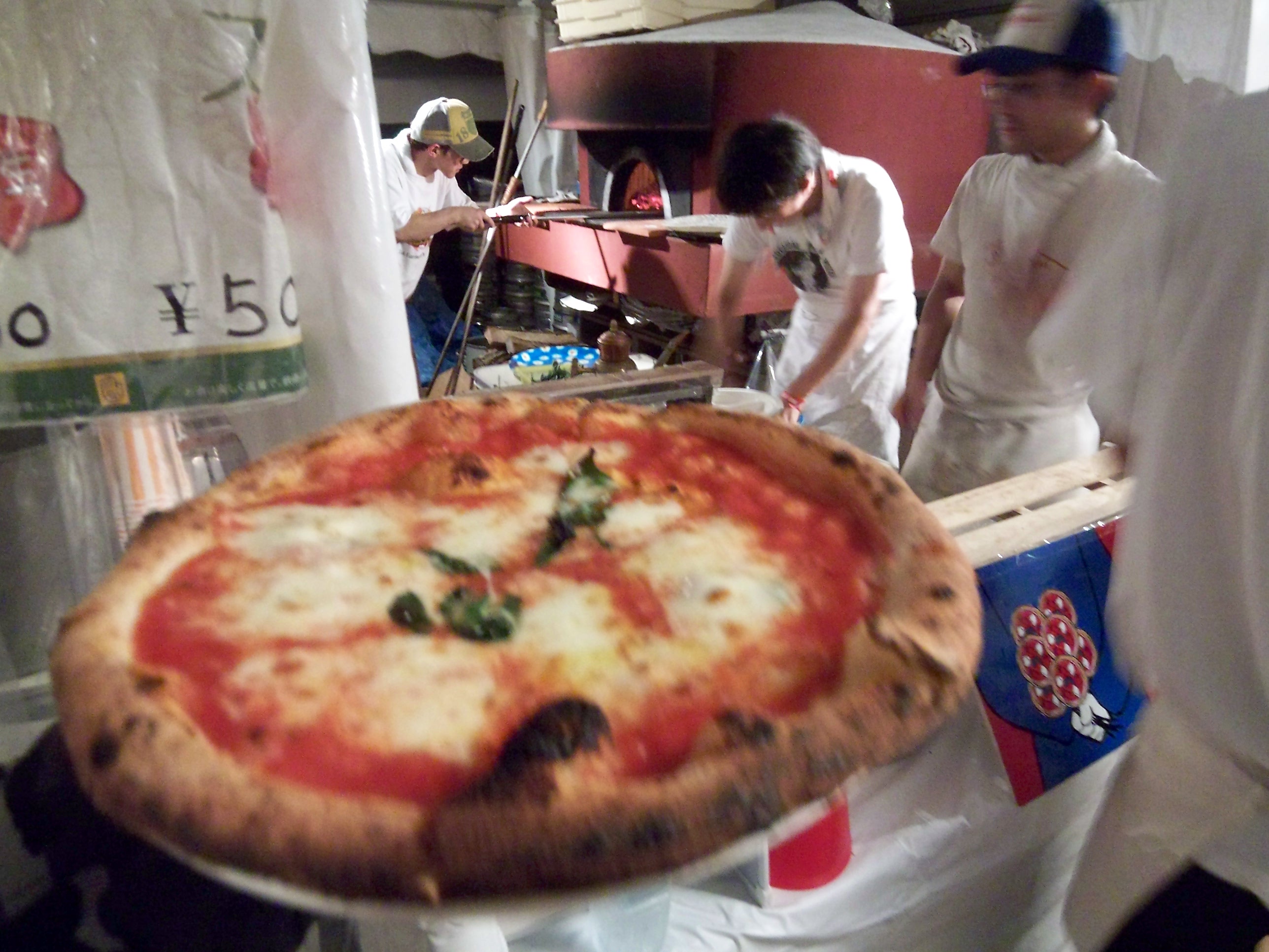 岡山の有名店サクラグミの屋台でピッツアマルゲリータ、ちゃんと窯で焼いてます。昼間もピザ?夜もか!そうなんです。こことオアシスエリアのピットーレのピザは私の密やかな楽しみ。持参したポートワインで舌鼓。