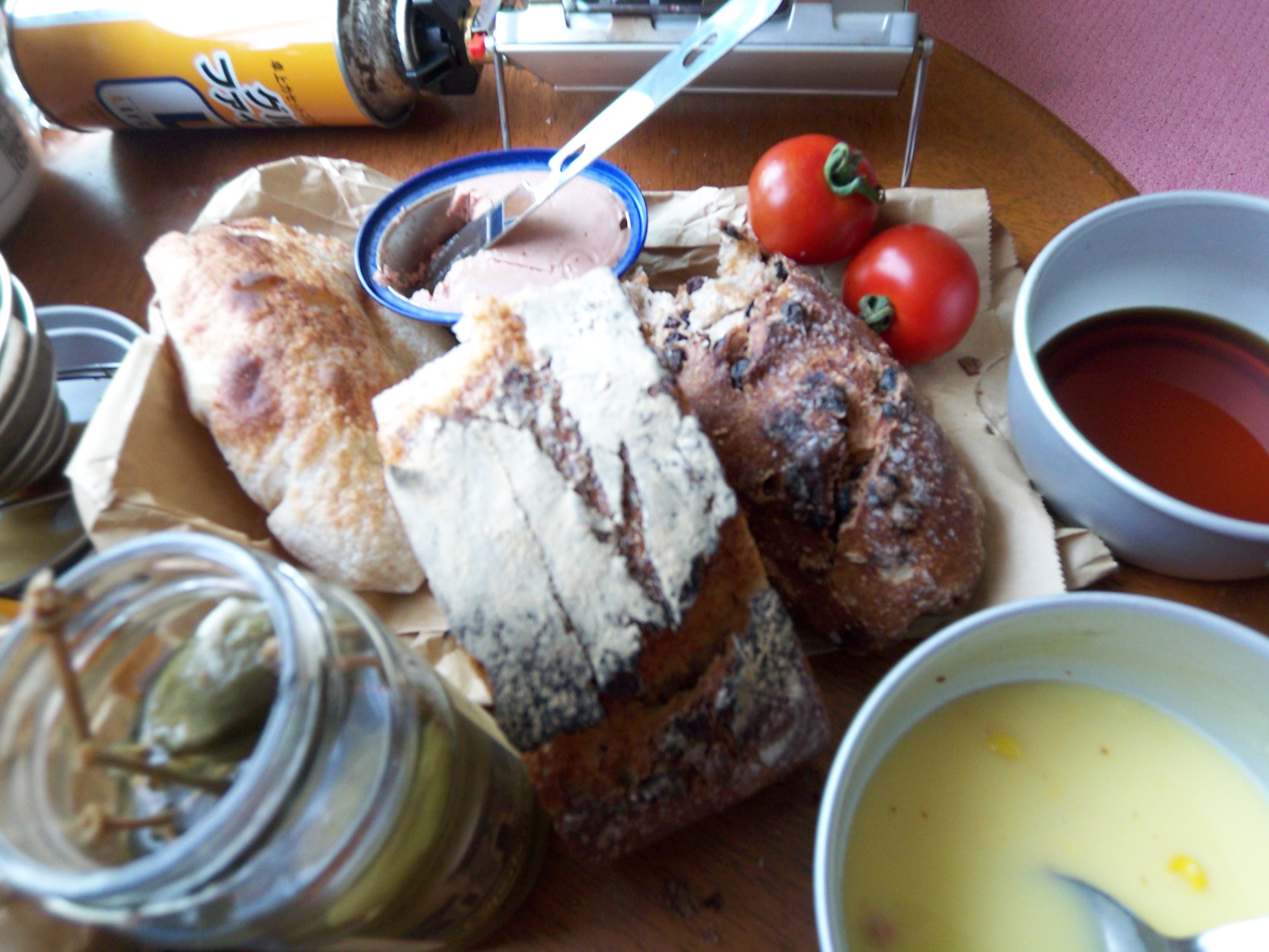 左からViciniのパン、ルヴァンのカンパーニュ、レーズンパン。持参したグースのパテ、ケイパーベリーのピクルス、コーンスープにコーヒー。レーズンパンにパテをぬり口にほおばるとともにケイパーベリーも口に投入、肉の臭みをケイパーベリーが消してくれてうまうまです。