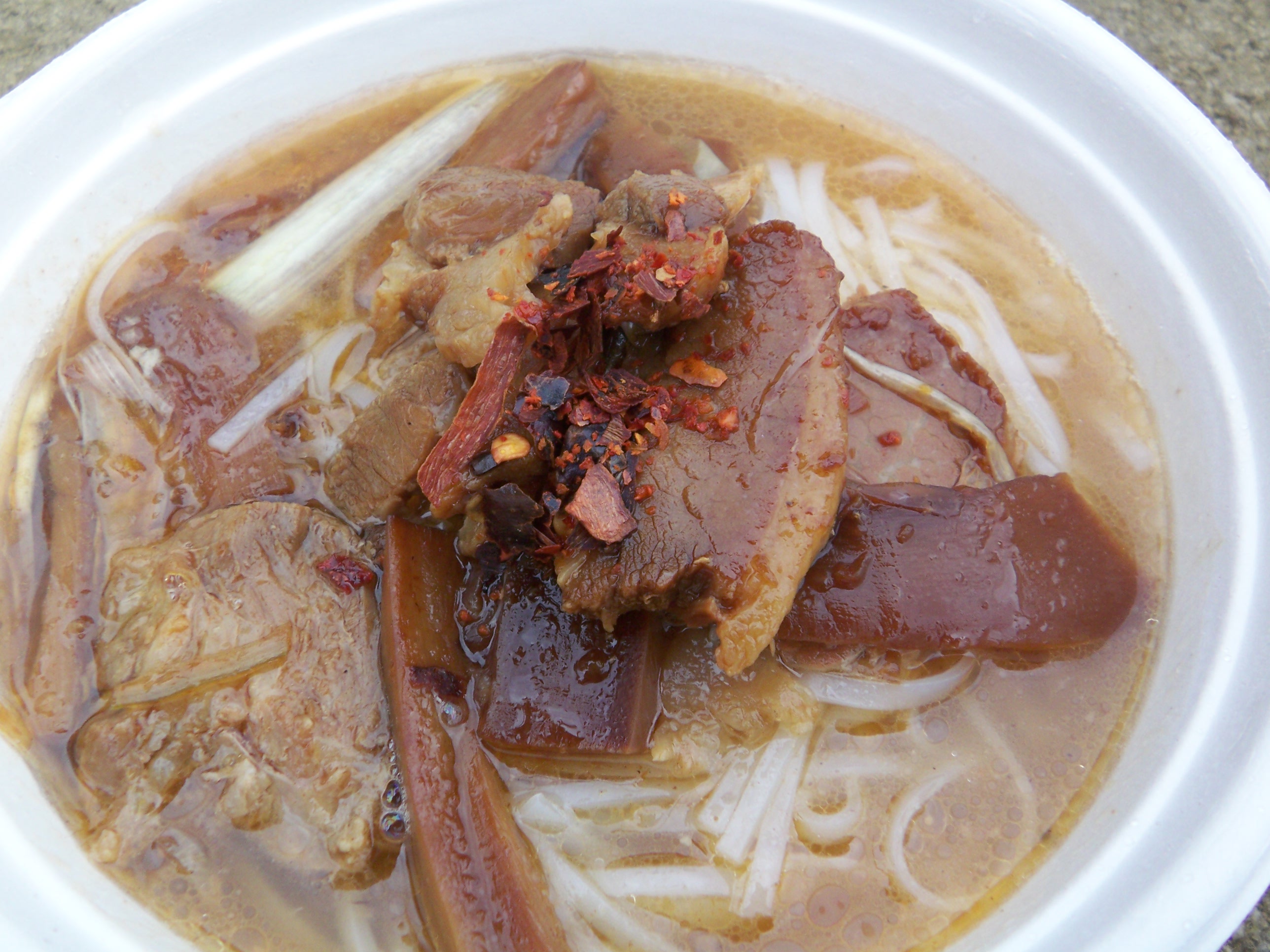 台湾料理の屋台で豚バラとネギの煮込みのせ台湾ラーメンを注文。醤油ベースで八角の香りがほんのり、お米の麺で口当たりがよくるするっと平らげる,見た目よりあっさりで美味。
