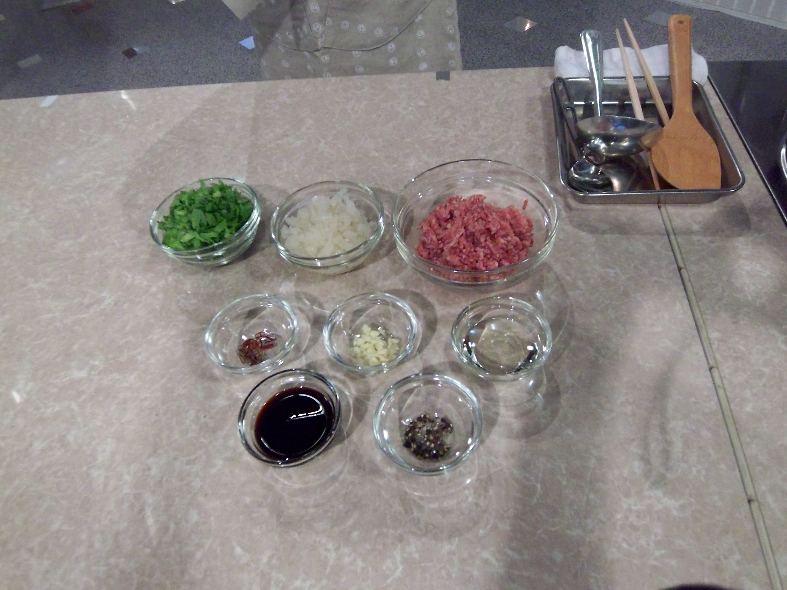 材料、豚ひき肉、らっきょ、セッロリの葉、オイスターソース、、、