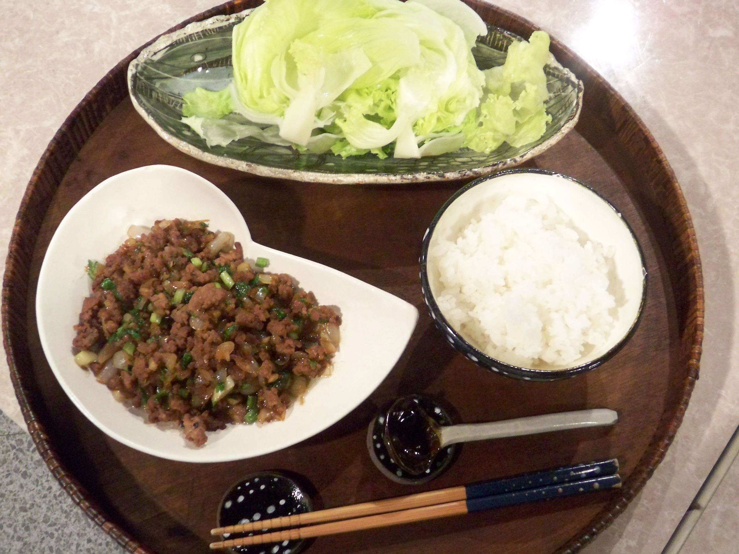豚ひき肉はフランス製の貝の形のお皿、ご飯じゃ椀とレタスがのっているのは陶器市で、陶器製のレンゲは藤本優さんのものを神戸で買いました。今回のBGMも栗コーダーさん(訳ありリベンジ!)。
