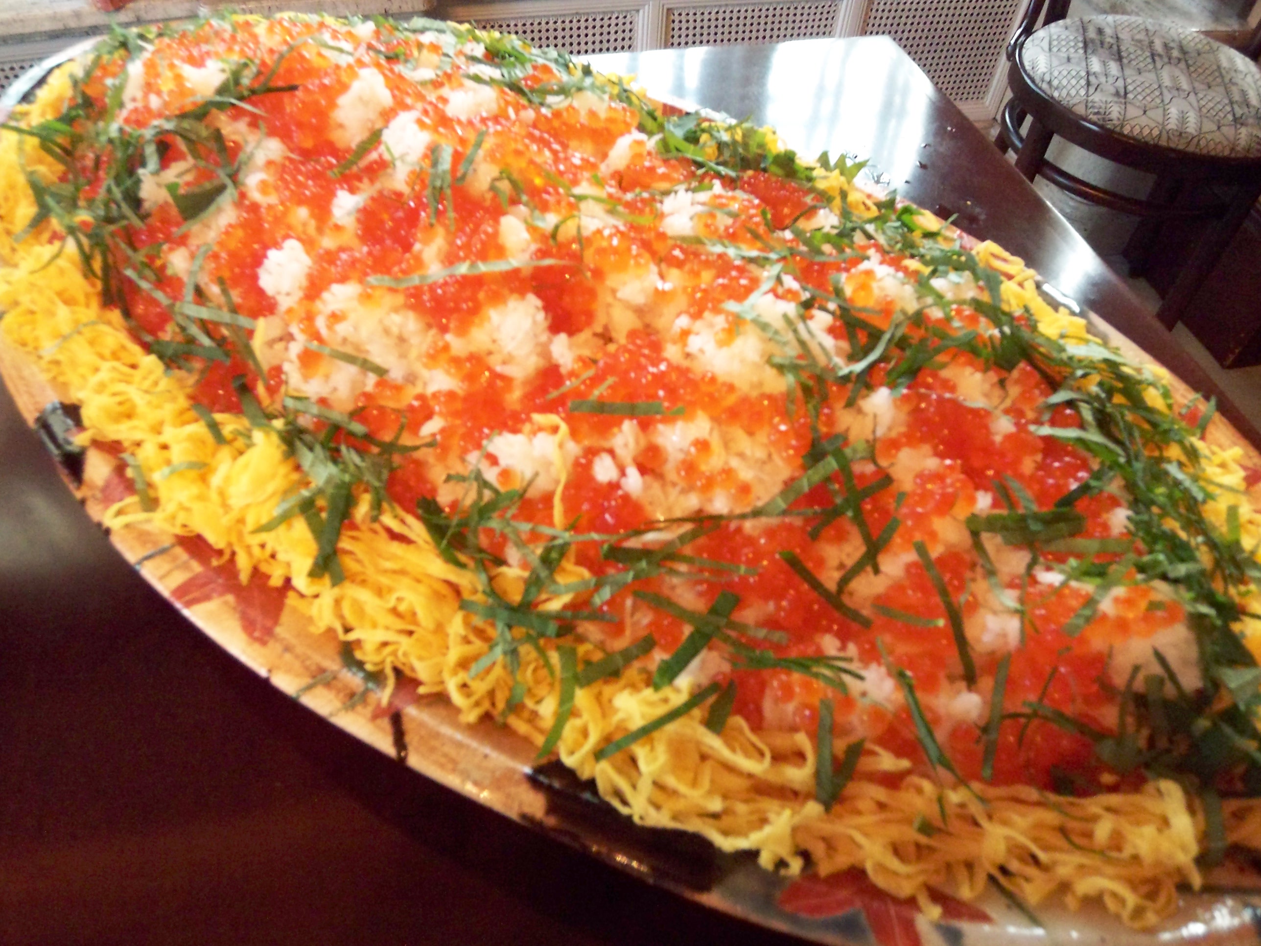 イクラたっぷりのお寿司。イクラは私の大好物、死ぬ前に何を食べるかの筆頭。まだあまり大きくないこの時期のすじこを網にのせてお掃除をし、お酒で洗って軽く塩をするのがお気に入り。お米はお皿にひっつきやすいので一番下に錦糸卵を敷いて直接お皿にふれない様にしました。
