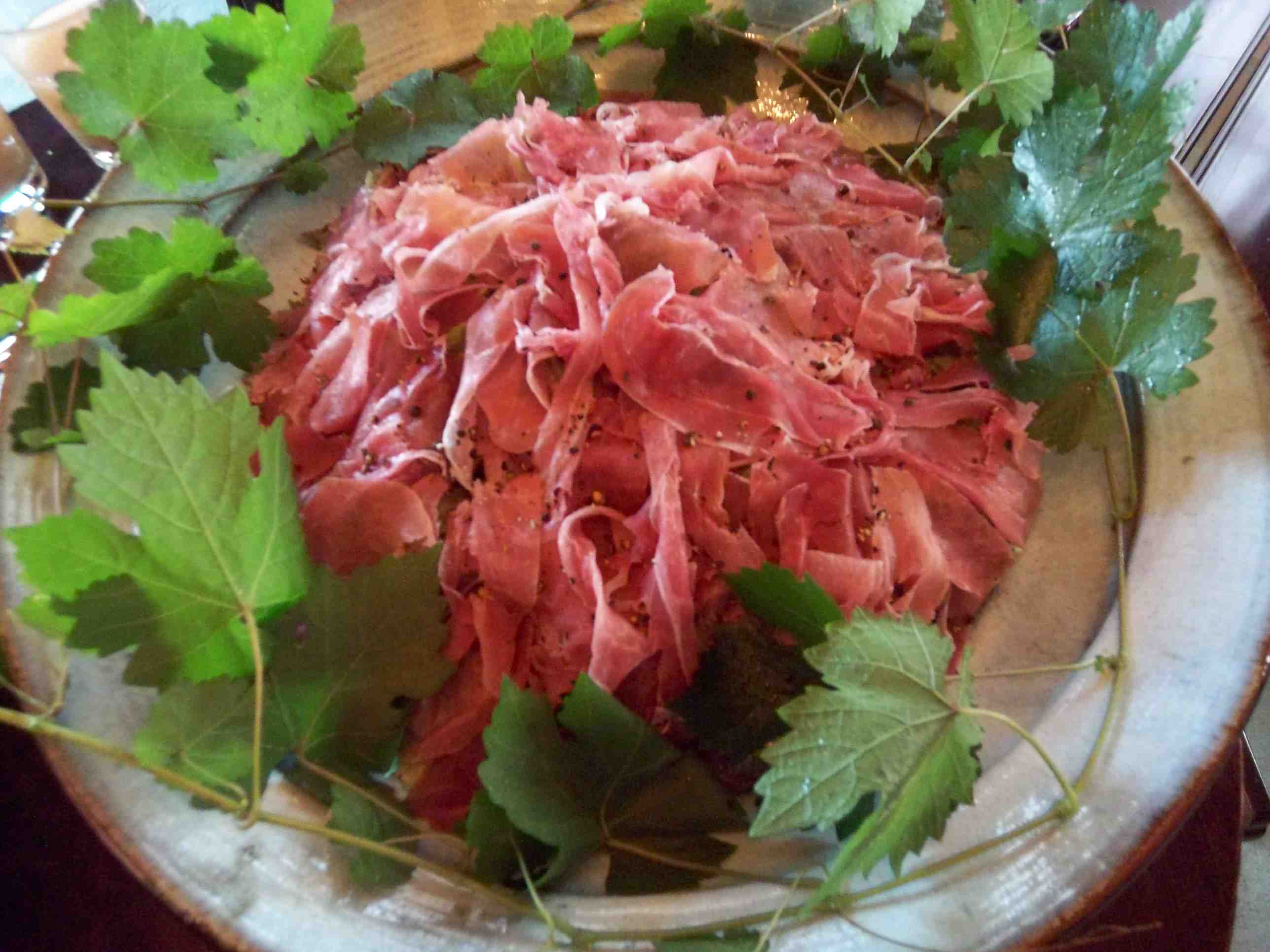 生ハムのサラダのまわりをぶどうのつるで飾り、直径60cmもある大皿にたっぷりと盛りつけてみました。グレーがかった薄い青紫のお皿の色に生ハムのグレーがかった赤い色とぶどうの緑色がきれいな取り合わせです。