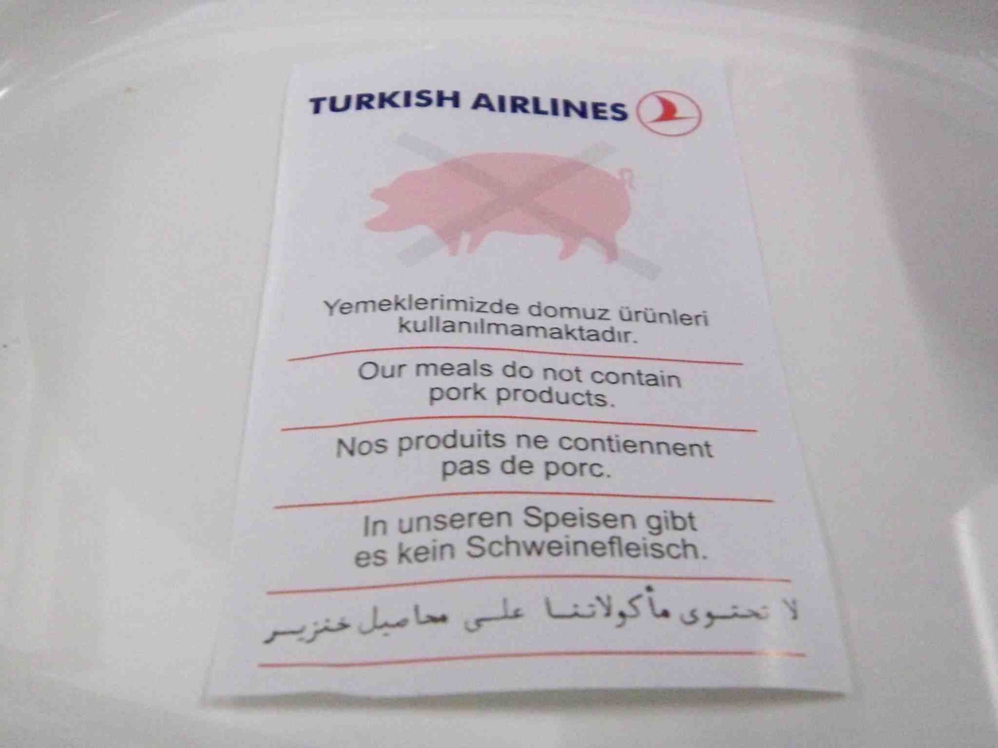 どの食事にもこの「豚肉使ってません」カードが。しかし機内はもちろんアルコール飲み放題?。トルコワインを飲み過ぎて爆睡。お尻が痛くて目覚めるともうすでに8時間後の未来。