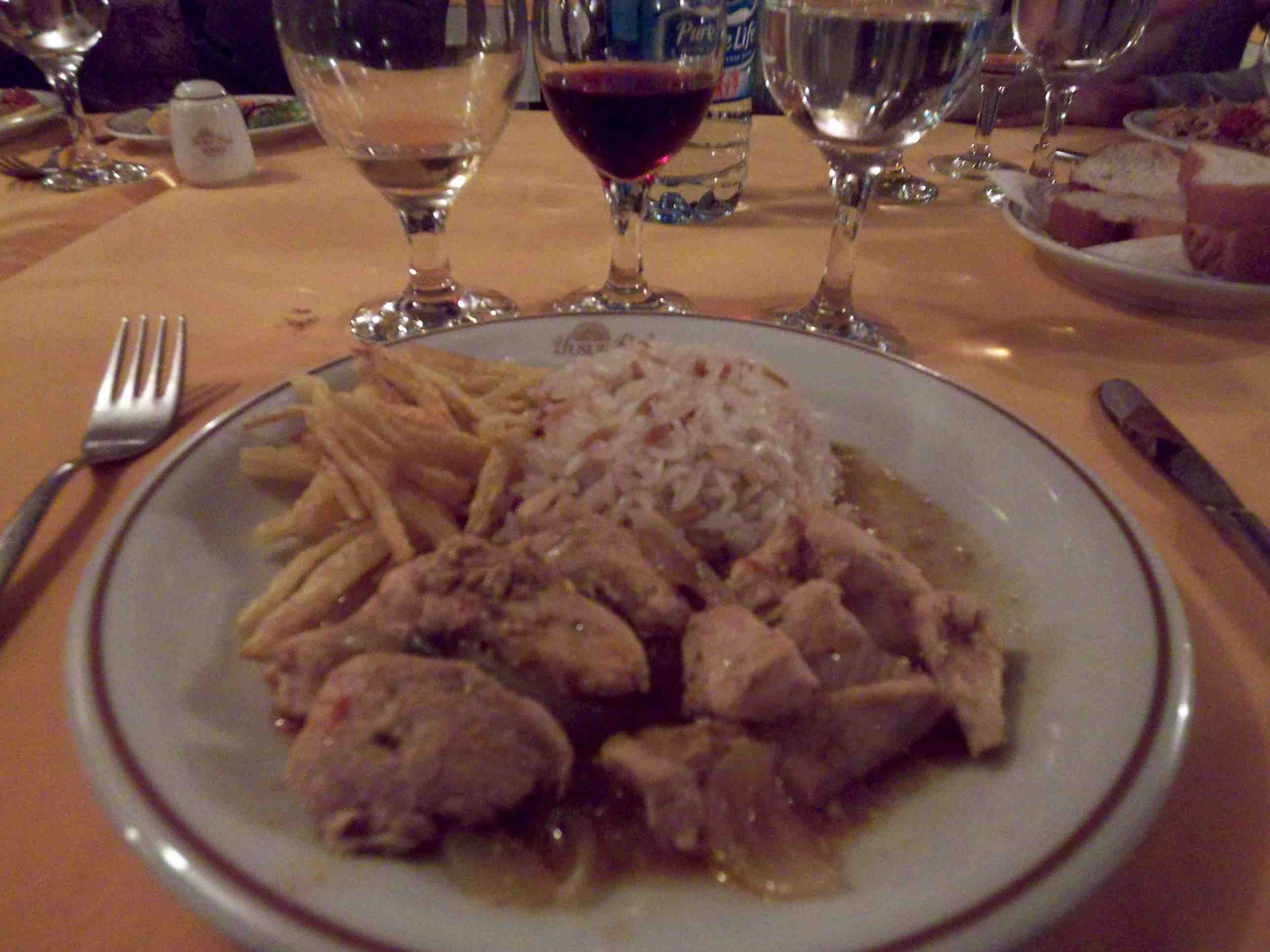 鶏胸肉、トマト、ピーマンのスープ煮込み、ピラフとフライドポテト添え。そしてチュラさんの赤ワイン、できそこないのピノのワールみたい。昼間に飲んだ白の方が美味しかった。