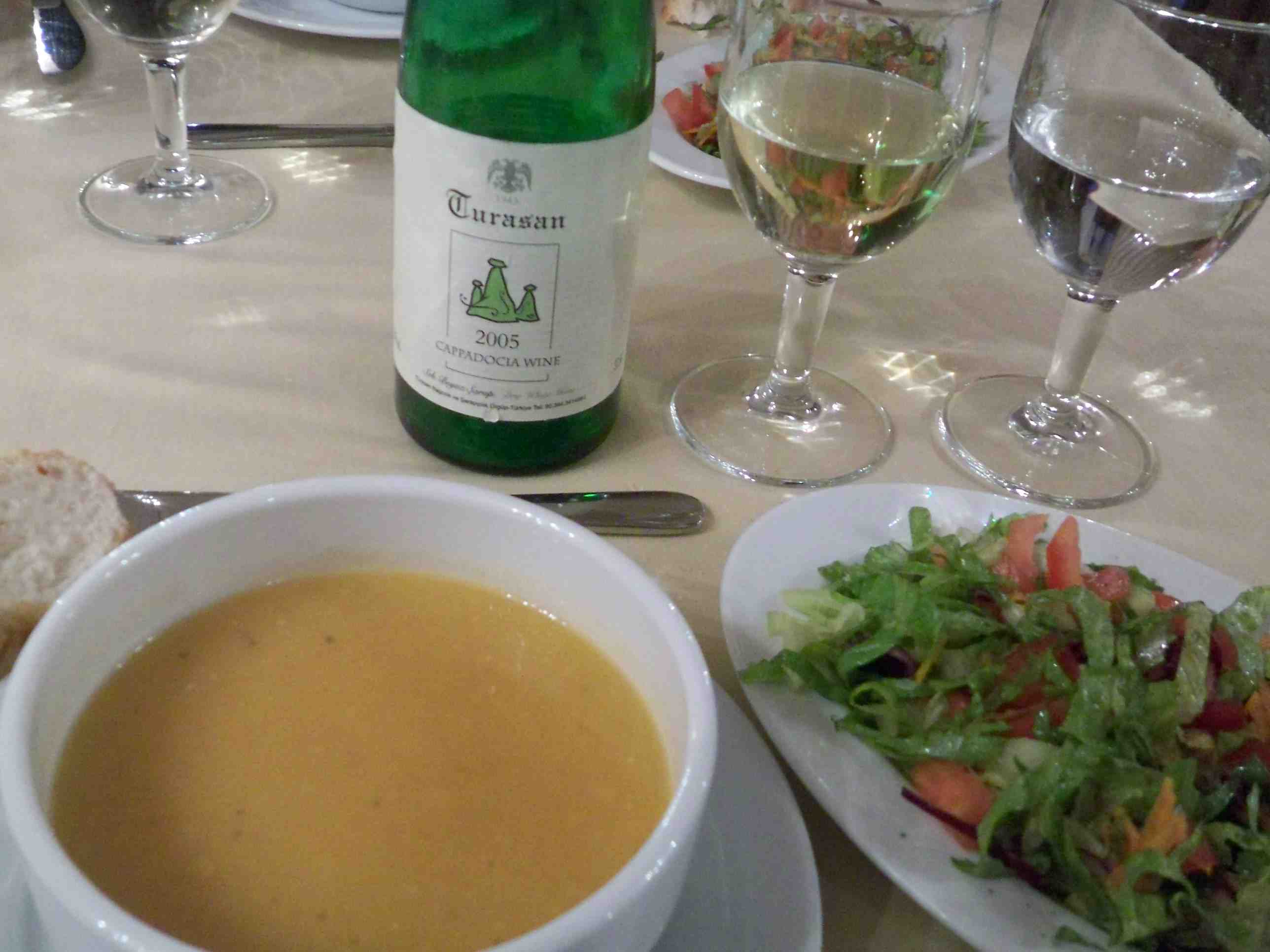 ひよこ豆のスープと野菜サラダ、地元の「チュラさん」ワイン。このあたりは有名なブドウの産地、ワインから干しぶどうまでなんでもある。
