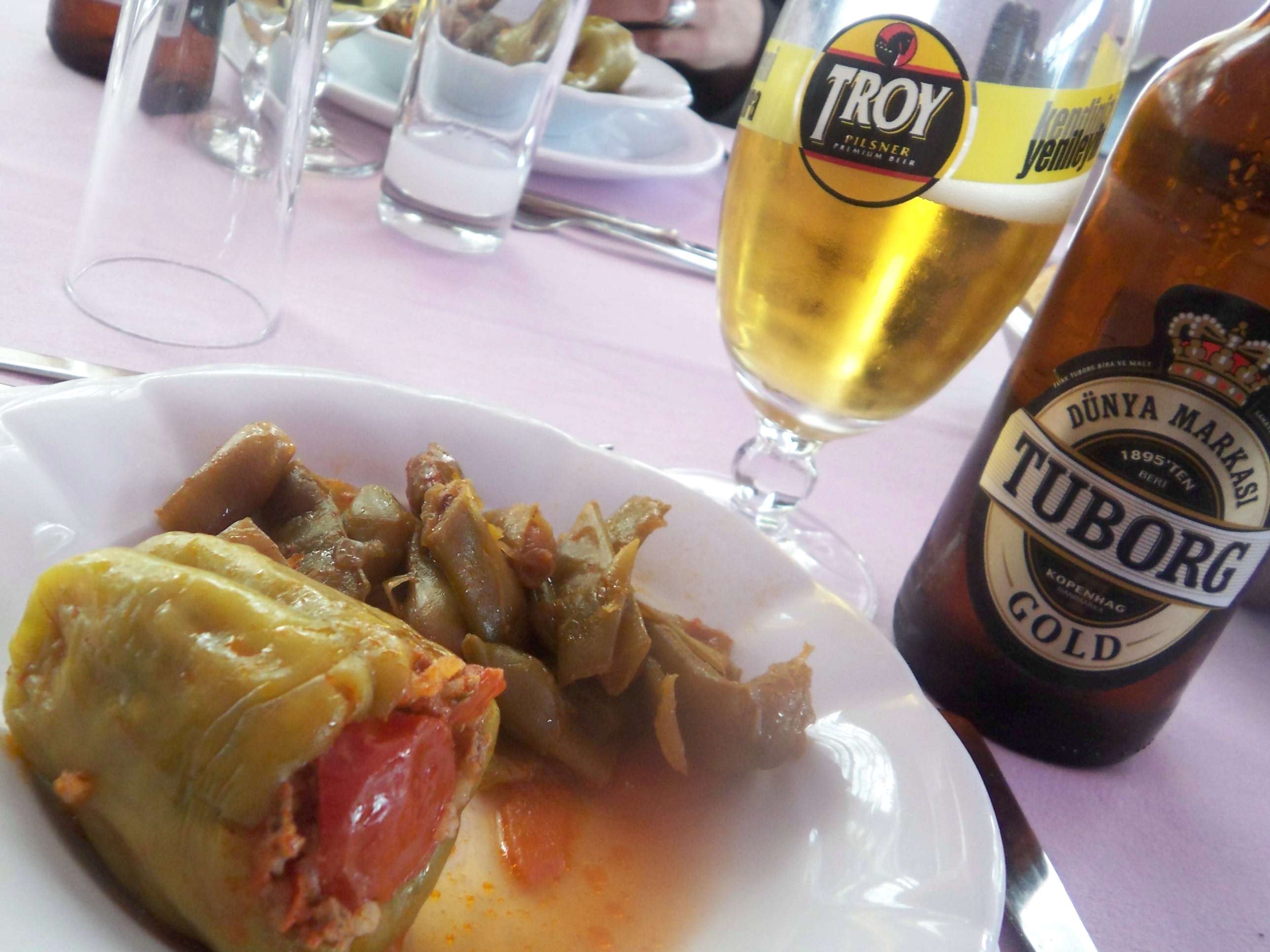 ピーマンにお米をつめたドルマと豆の付け合わせ。