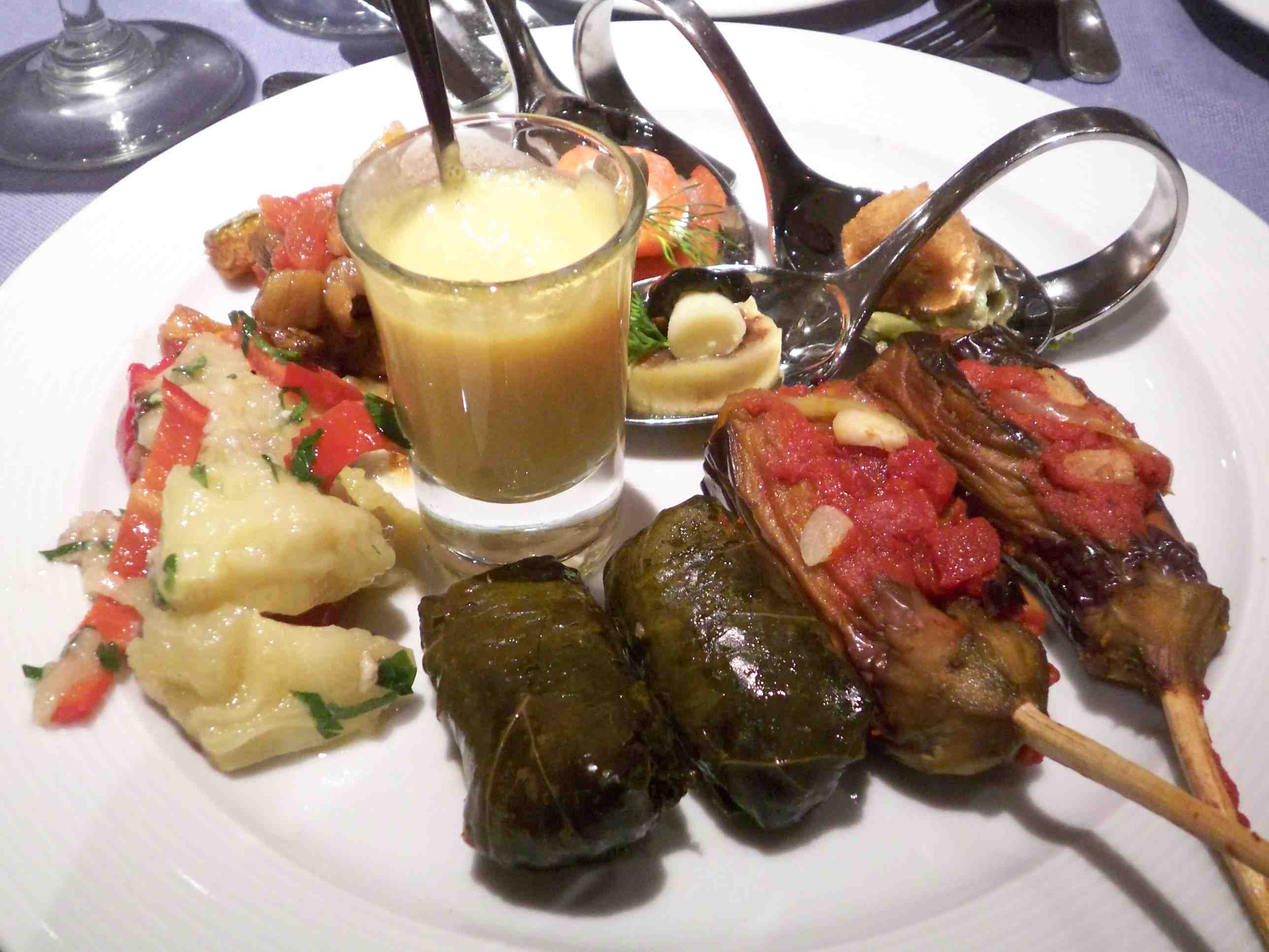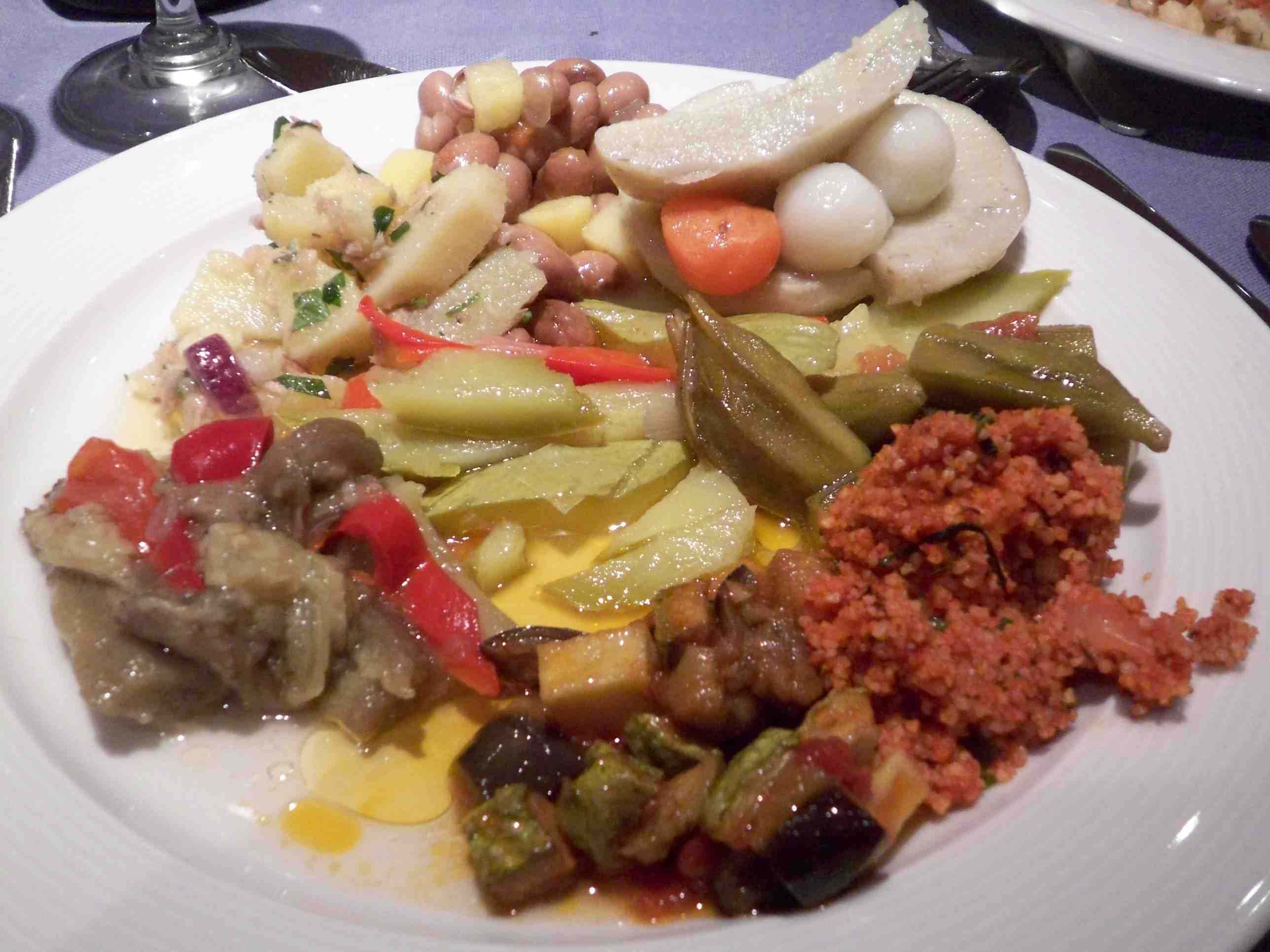 この盛り合わせは秀逸、手前は乾燥野菜を水で戻してつくるマリネ。左回りでクスクスのトマト煮、オクラのマリネ、ボトムアーティチョークのマリネ、後は豆,ジャガイモ、ナス、ズッキーニのマリネ