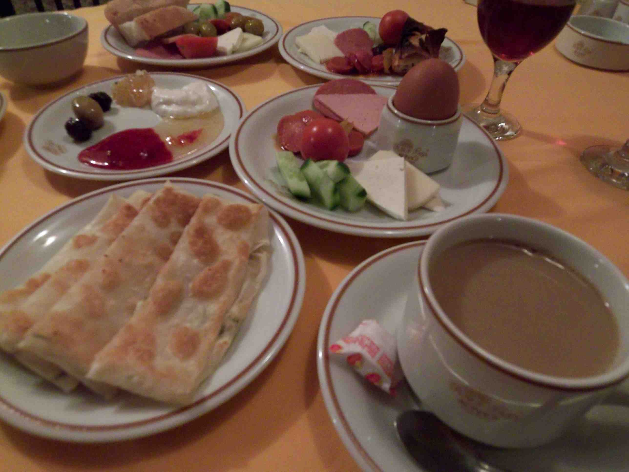 朝ご飯、手前は中にチーズが入った小麦の皮を焼いたギョズレメ、春巻きのよう。