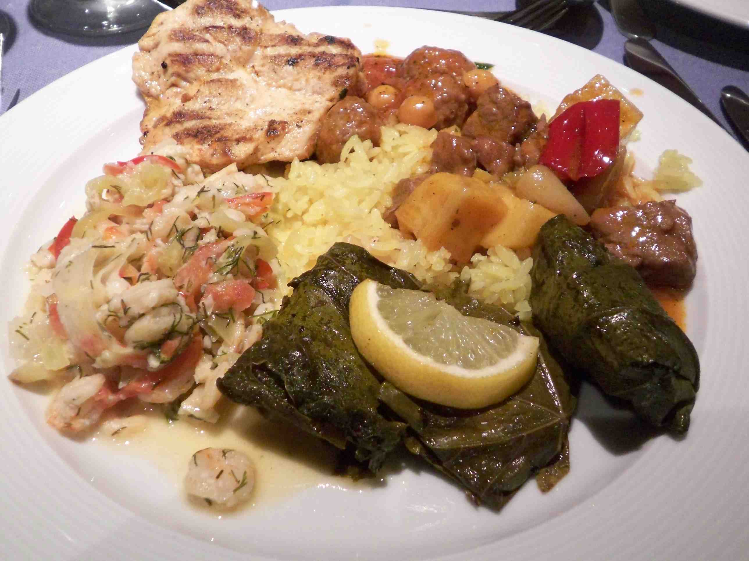 手前は白身魚をぶどうの葉で包んだドルマス、左回りで羊のトマトに煮込み,チキンのソテー,小えびのクリーム煮ディル風味