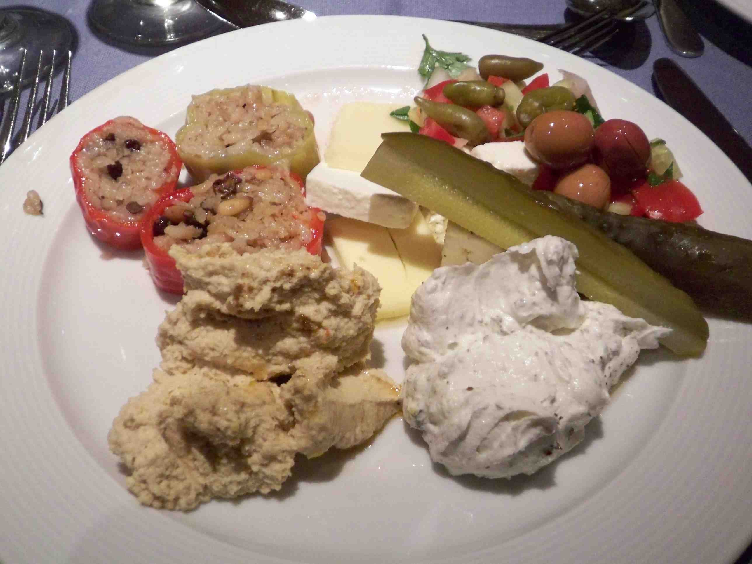 手前左はクミン風味のひよこ豆のペーストハマス、左奥はピーマンのご飯詰めドルマス