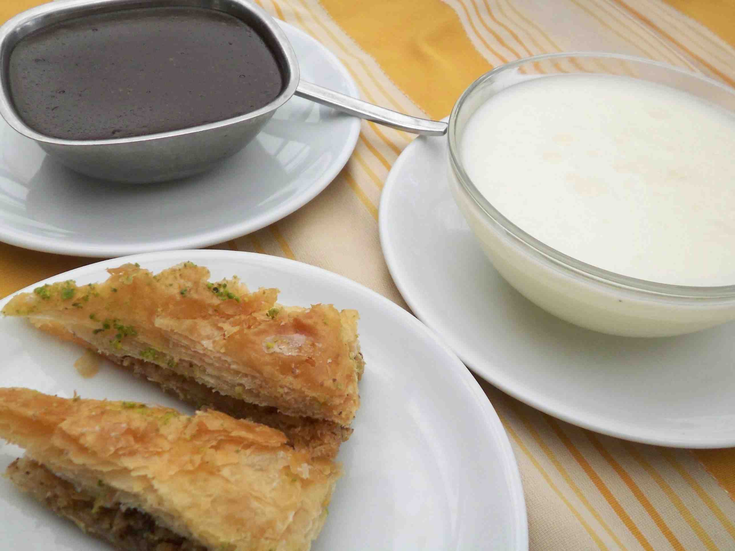 シロップたっぷりのパイ、バクラワ。粉末のカスタードにココアを溶いて固めたと思われるチョコレートプディング。生姜とアニスが香るミルクプディンング。どっちも量が多すぎ&甘過ぎ。