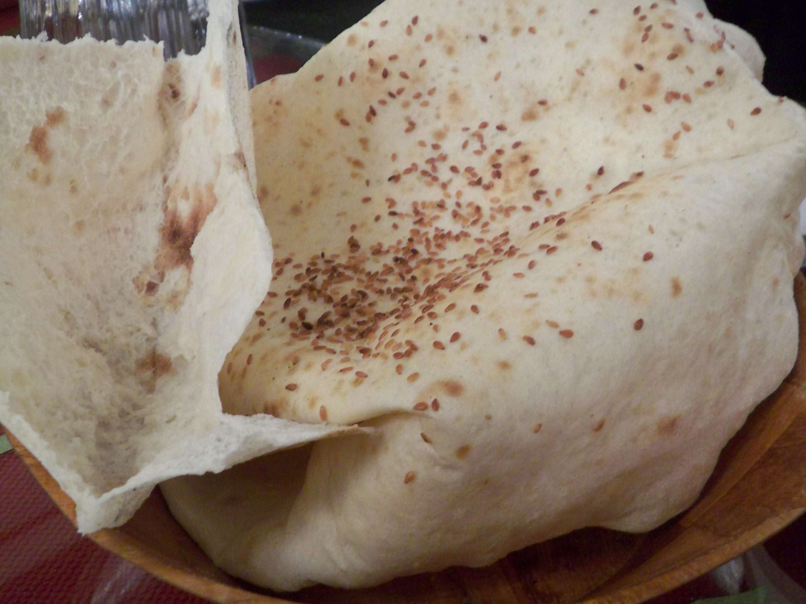 小麦粉を薄くのばして焼いたパン。店先で作っている様子が覗くことができる。他のテーブルのお客さんはトマトと野菜の前菜エズメをのせながら食べている。