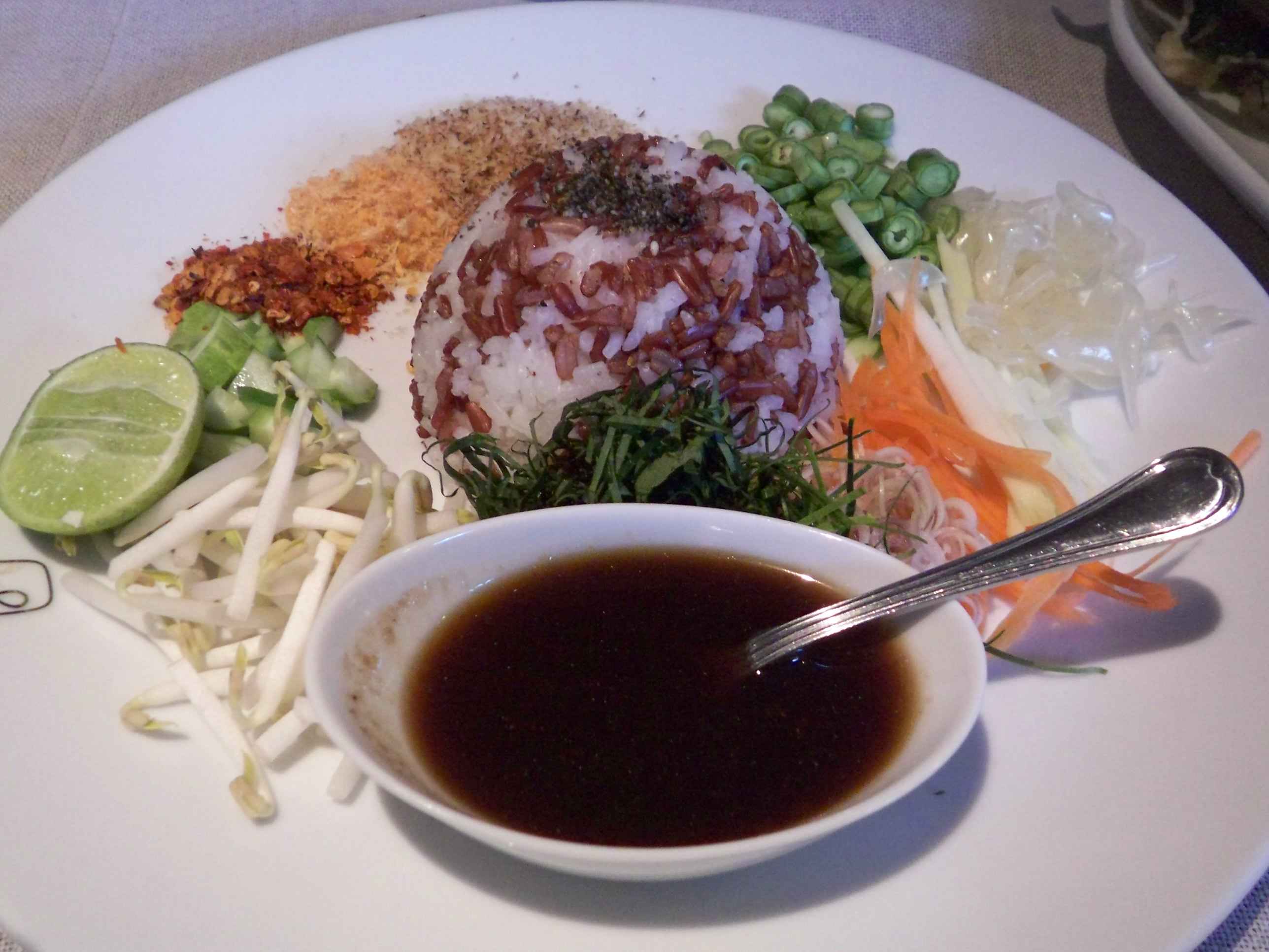 黒米の混ざったお米に各種お野菜とソースを混ぜて頂くライスサラダ。あっさりとしていていろいろ応用が利きそうなメニュー。