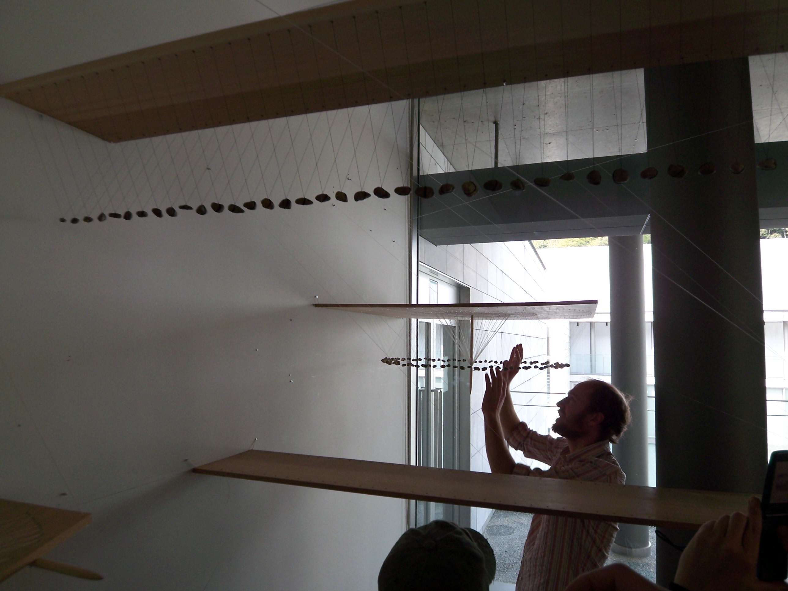 昨日見た映像が超アナログで再現されている。木のレバーを回すと糸で吊られた小さな石がスクリーンセーバーの様に規則的に動き出す。同じ宇宙がモチーフでもこうも違うと面白い。南アフリカのジャスティン作。