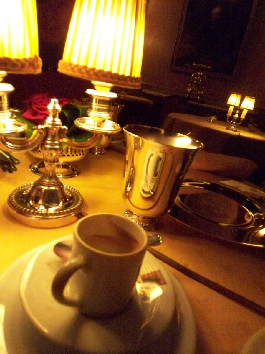 サロンで待ち合わせ、シェリーを注文。運ばれてきたシェリーにびっくり!薄いチョコレート色のビンテージシェリー。う、うまい、、が、後の支払いが怖い。隣の席の大人のカップルはジントニックを注文していた。そ、そんな手もありか〜、う〜ん、先が思いやられる。