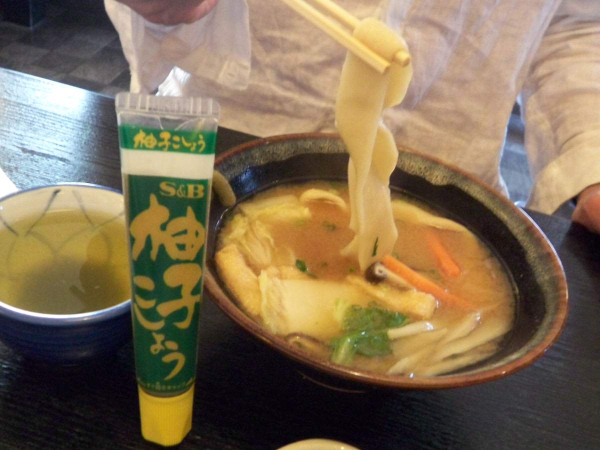 とりあえず昼飯。すいとんを伸ばした様なでっかいうどんの入ったみそ汁(だんご汁)が郷土料理らしい。SBのチューブ入り柚子こしょうをどばっ!といれて頂くのが現地流。それよりこんなの初めて見た。帰りのお土産はチューブ入り柚子こしょうで決まり(この後、スーパーで6本購入)。