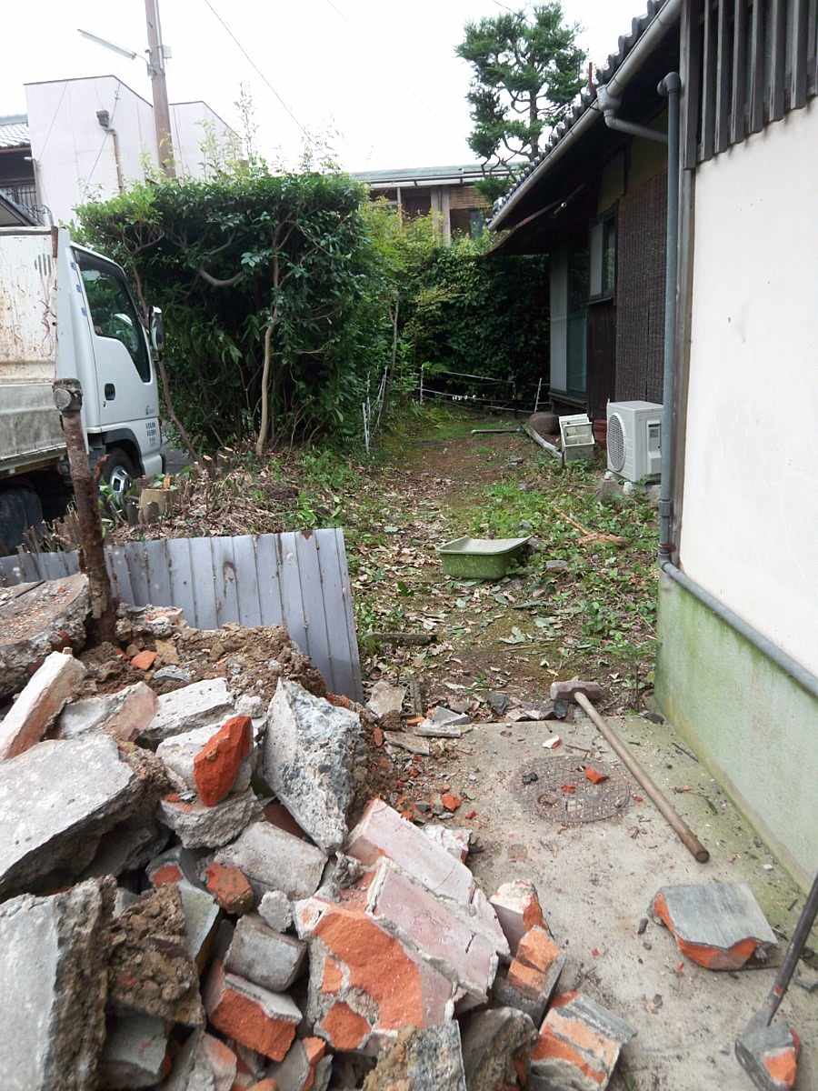 8月に入り、とうとう、プロによる工事が始まった。裏庭の垣根とブロック塀が瞬く間に取り外され駐車場にと整地。