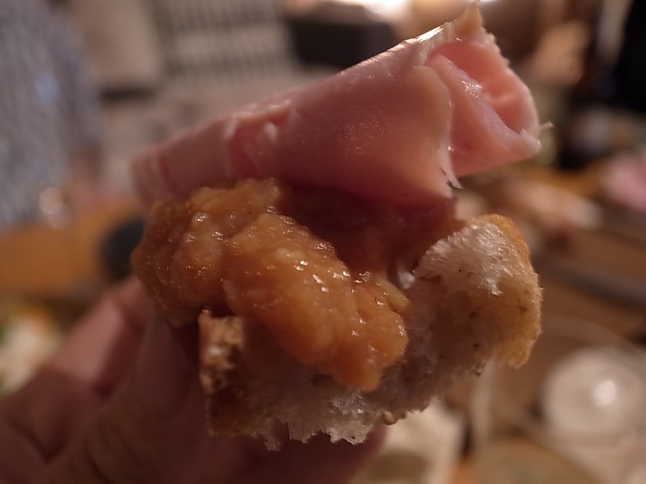 遠来からの客人は料理上手で、これはイアンのふるさとの味。スライスしたパンの上に手製の赤レンズ豆のパテ、そしてハムがのる。ハムと豆のパテがよくあうのだ、