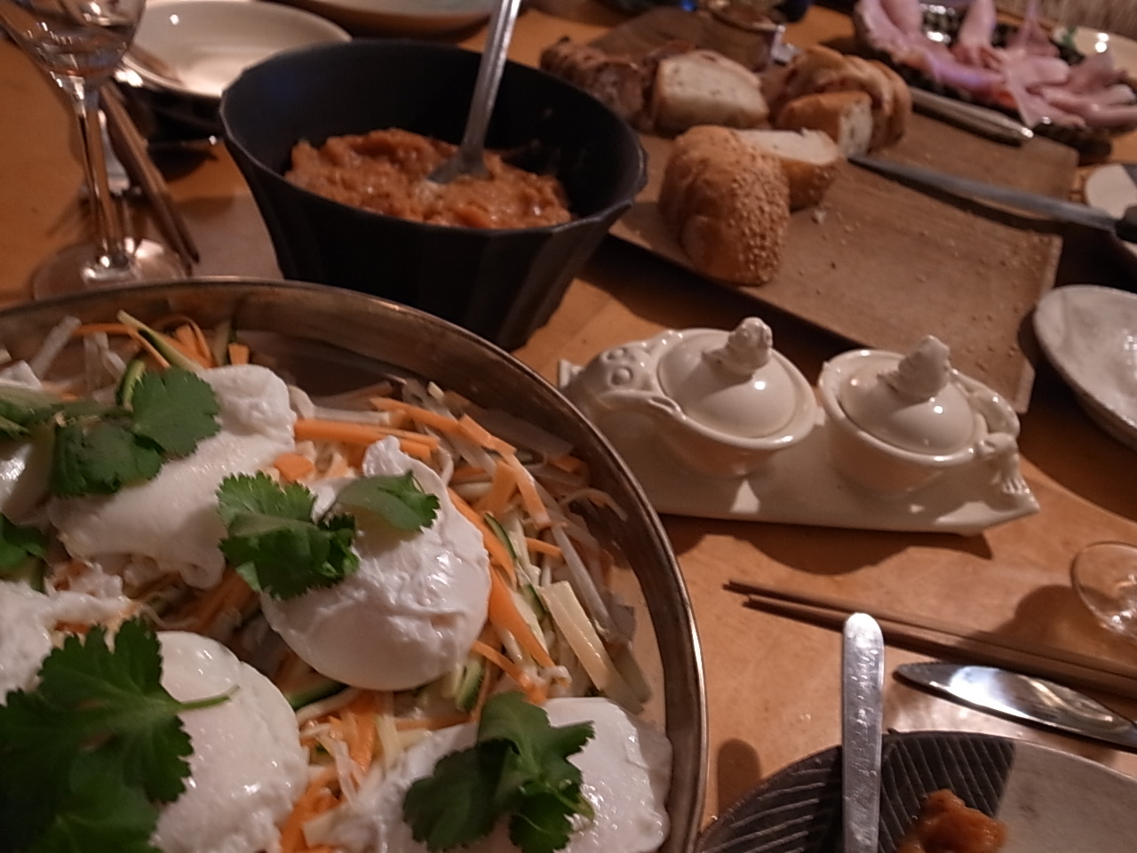 ポーチドエッグの下には細切りのごぼう、ズッキーニ、人参、ほんの少しのったパクチーの香りがこのサラダの素晴らしいアクセント。もてなすどころか、すっかりこちらがもてなされ、、