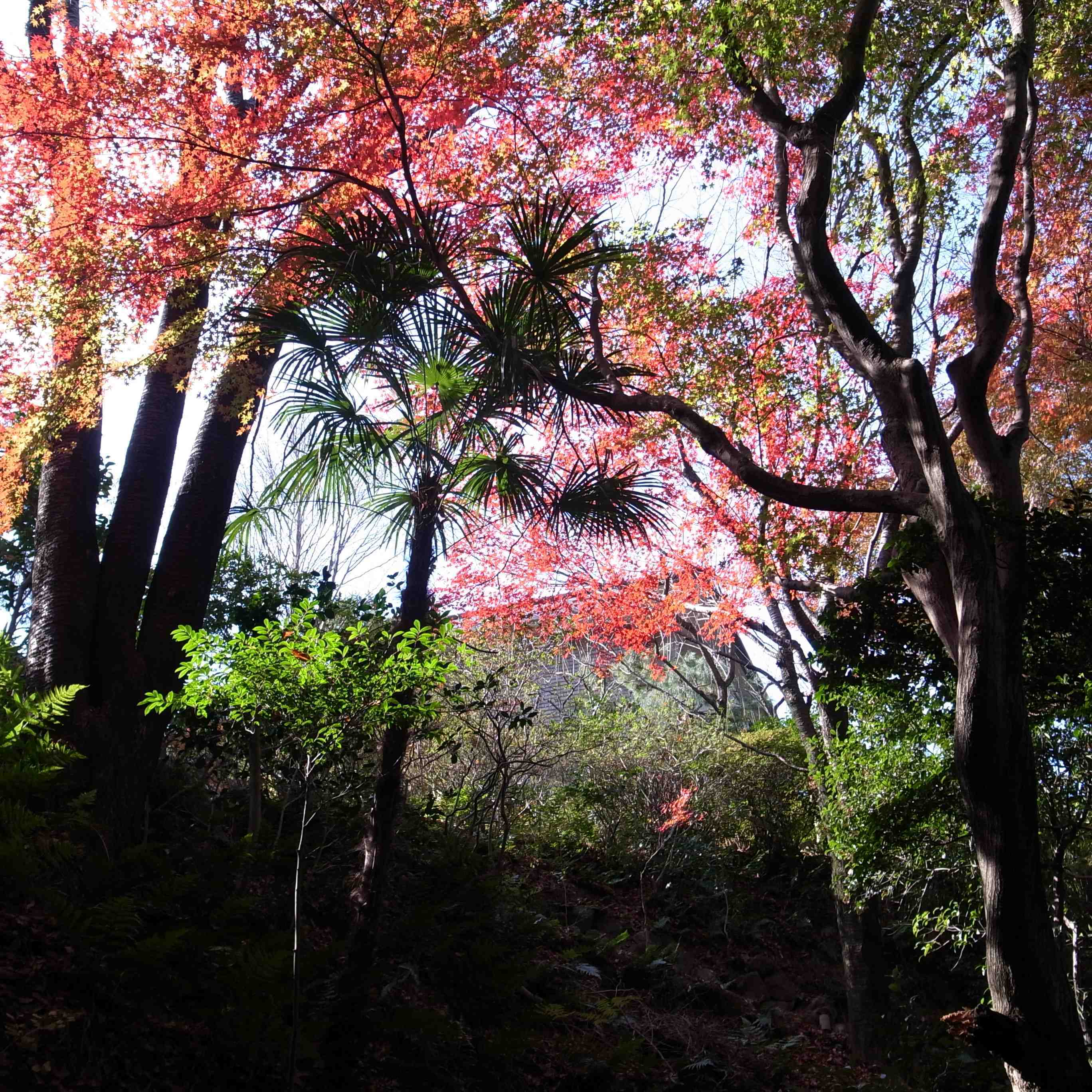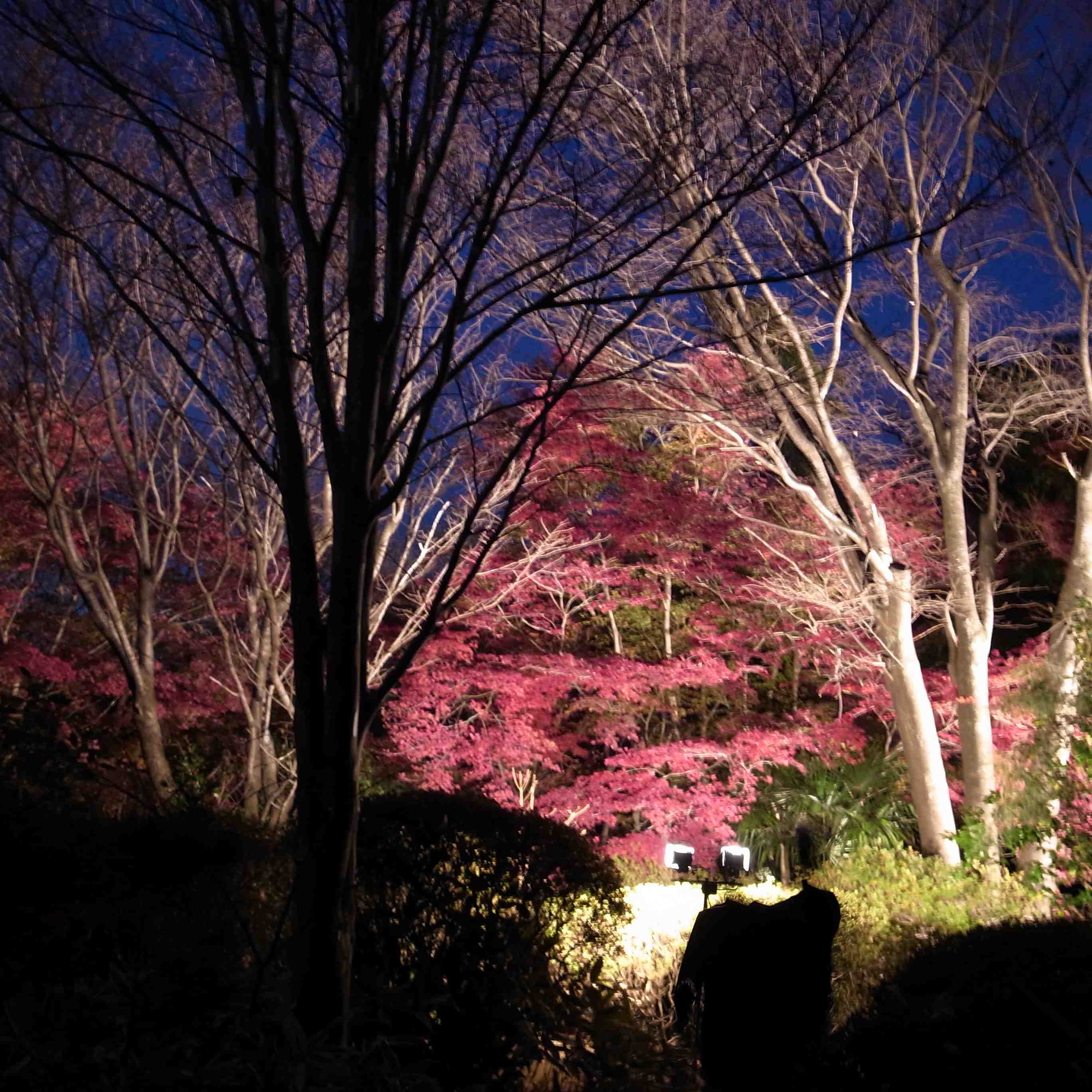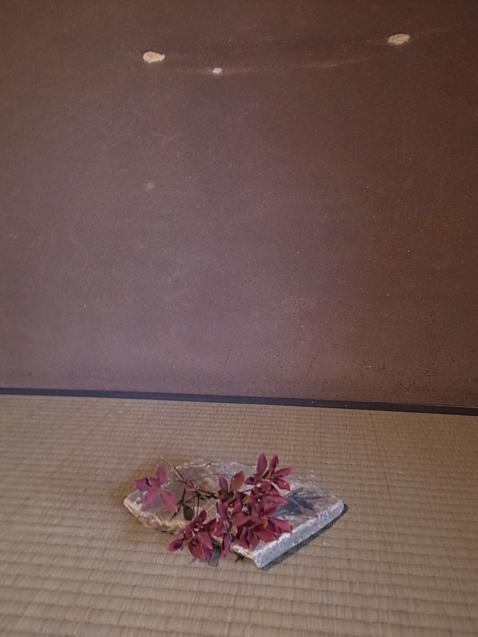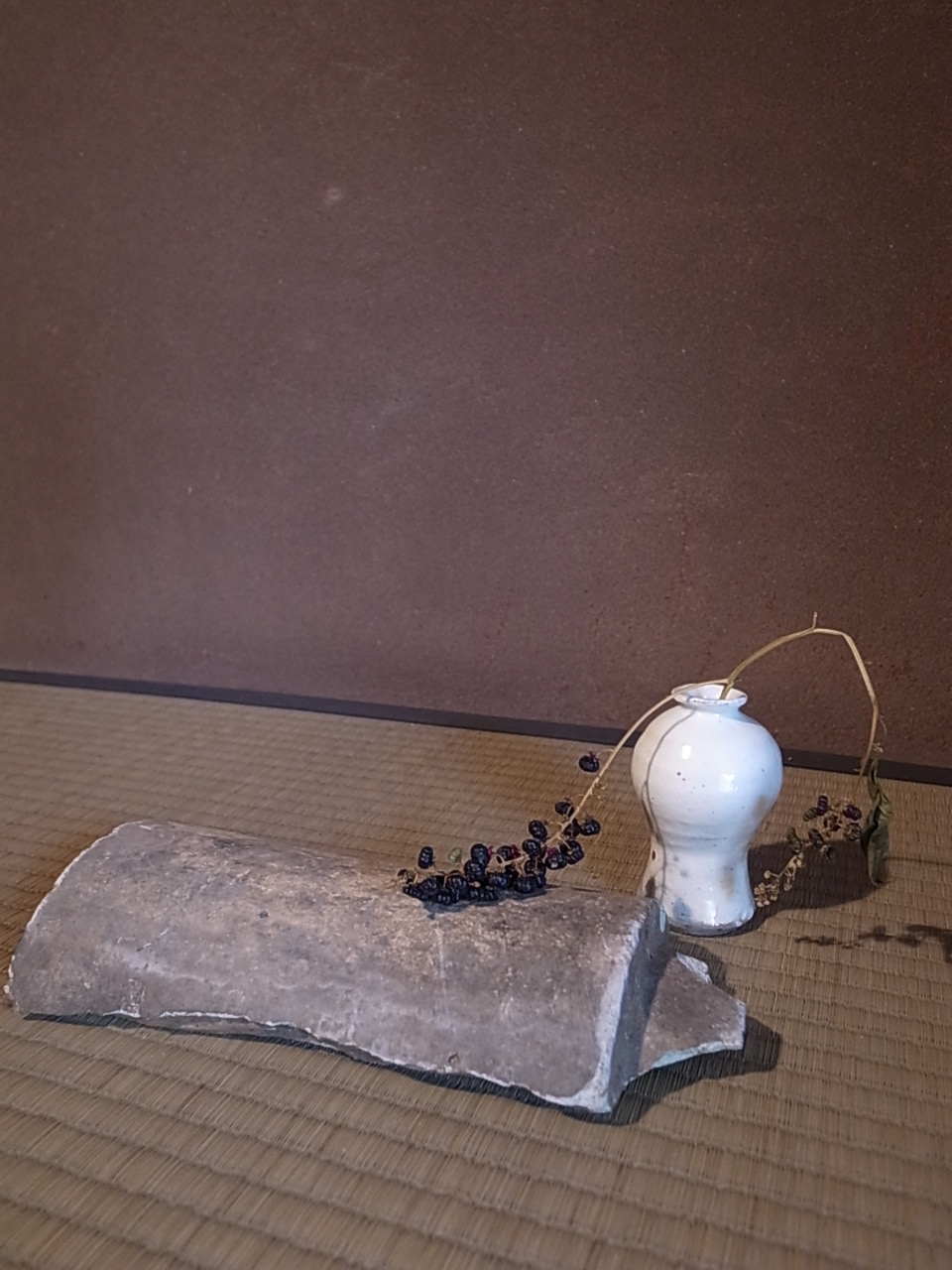この日は末富さんのお茶菓子! わが家の茶室で、花いけを楽しむ。この日は近所でつんだヤマブドウに粉引の小さな壷。 これは最近、庭からつんだドウダンツツジの赤い葉と近所の山の中で拾った古い瓦片。 ここ近年で最高の紅葉を今年は楽しんだ。わが家の庭もこのようで、 夜にはライトアップをしてみたり、ほんとに美しい秋だった。