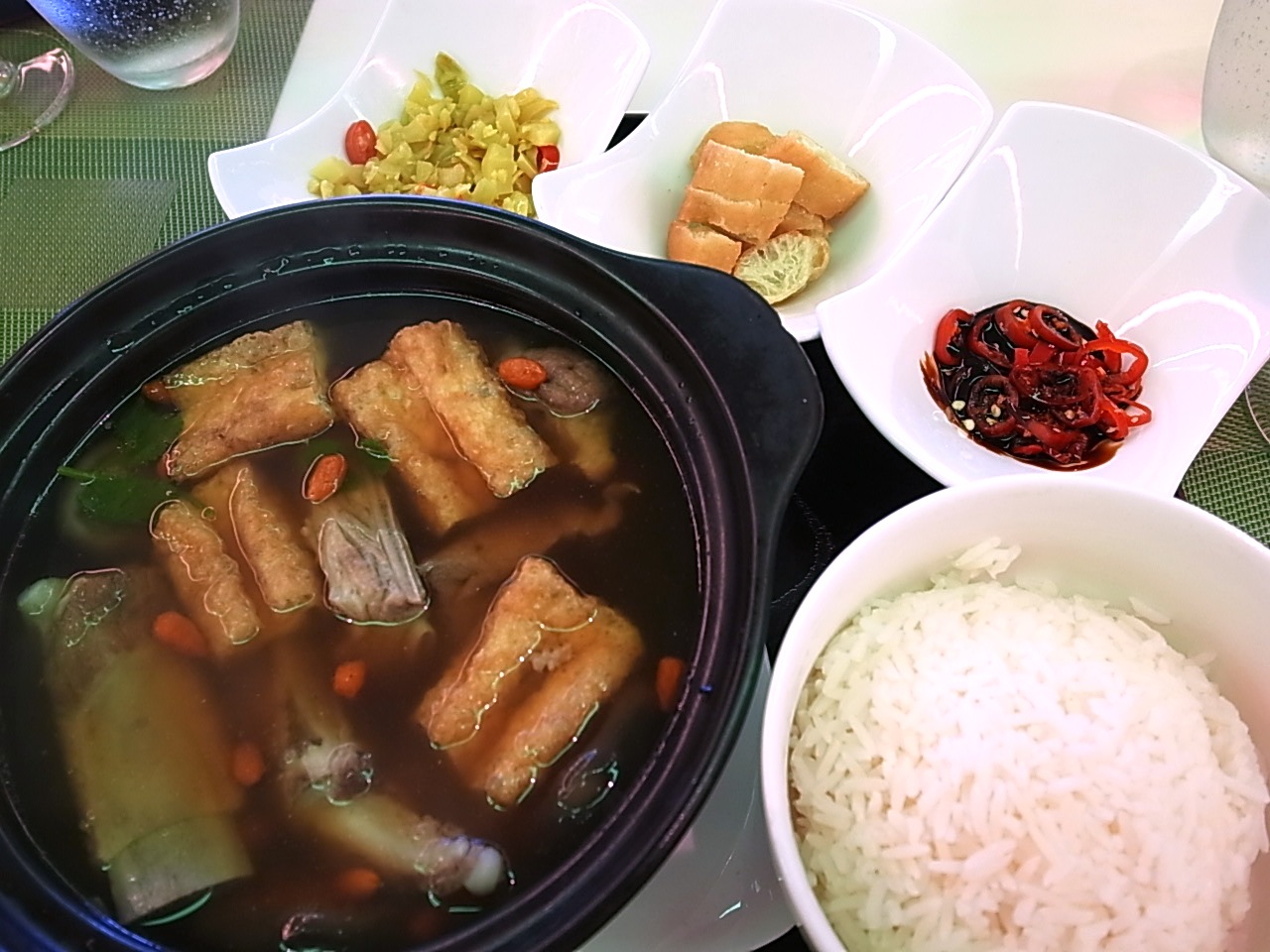 これも国民食バクテー、漢字では肉骨茶。スペアリブの薬膳スープ、油条をのせてご飯にかけて頂く。バクテーはお店によってほんとに違う。ここのはスープのうまみもさることながら肉の柔らかさが素晴らしい。お昼過ぎの広い店内はすでに満員御礼。あたりの席を見回すと9割9分の人が海南チキンライスを食べている。他のメニューも美味しいよ〜と、心の中で叫んでみた。