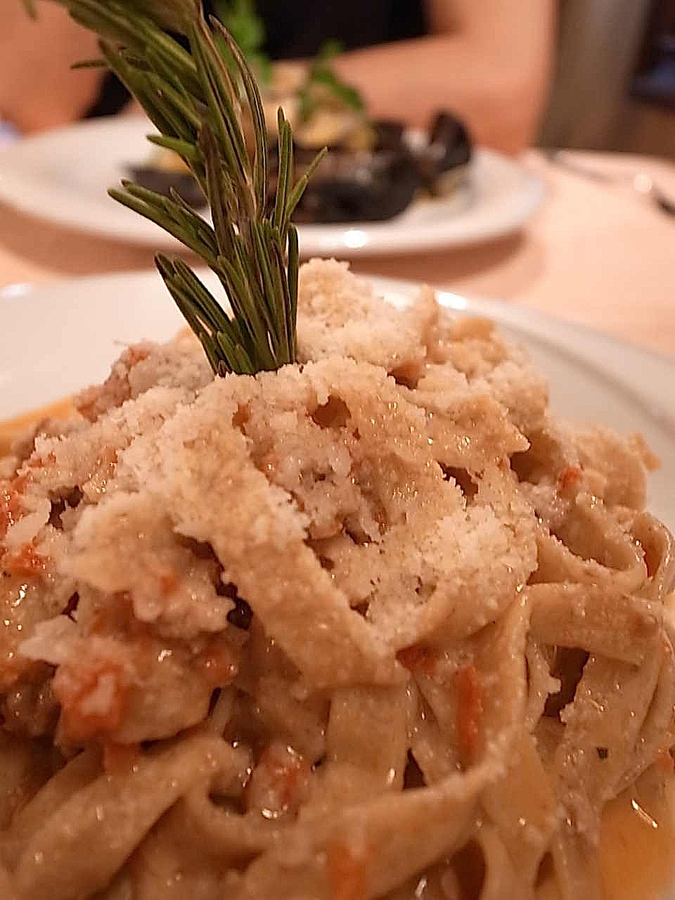 ランチのパスタが旨かった。昨晩、通りかかったときは溢れんばかりのお客さんで賑わっていた店。うさぎとドライトマトのタリオリーニ、相方はシーフードとサフランのリゾット、これもパーフェクト!