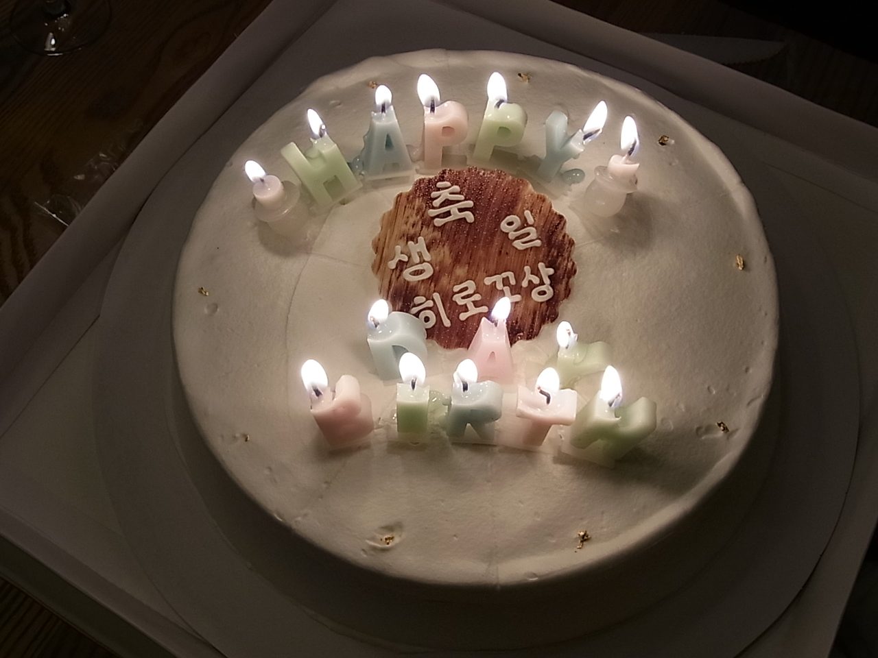 ディナーはヌーベルコリアキュイジーヌ。カンナムのおしゃれエリアの白いお店。着いたらビックリのサプライズパーティー!ハングル文字で「ひろこ誕生日おめでとう」。現地の友人シネちゃんの粋な計らい。ありがとう。