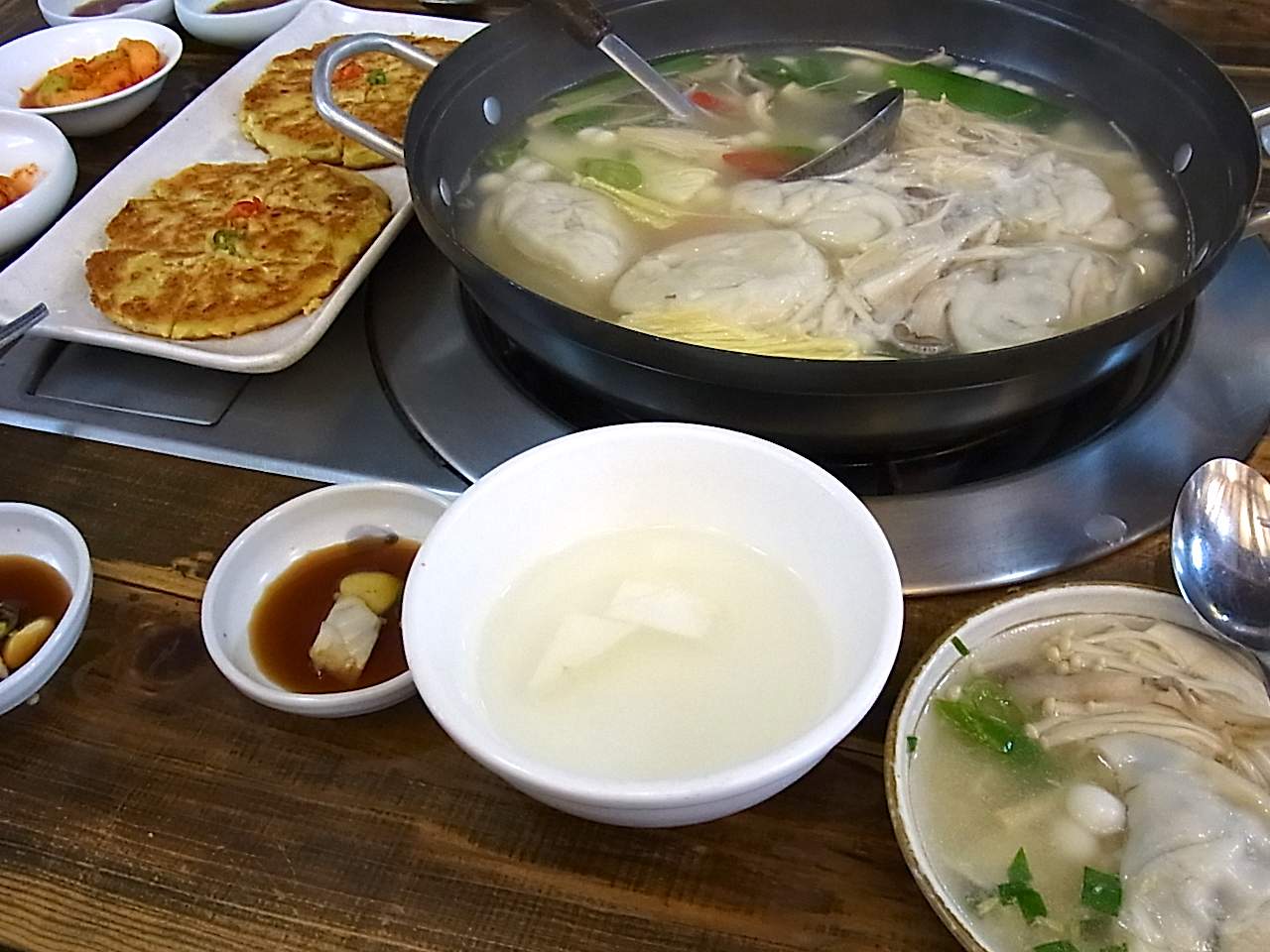 この日の専門店は、朝から晩まで「北朝鮮餃子鍋」一筋、三代。席に座るとキムチや付きだしが運ばれ、少し待つと鍋が準備される。