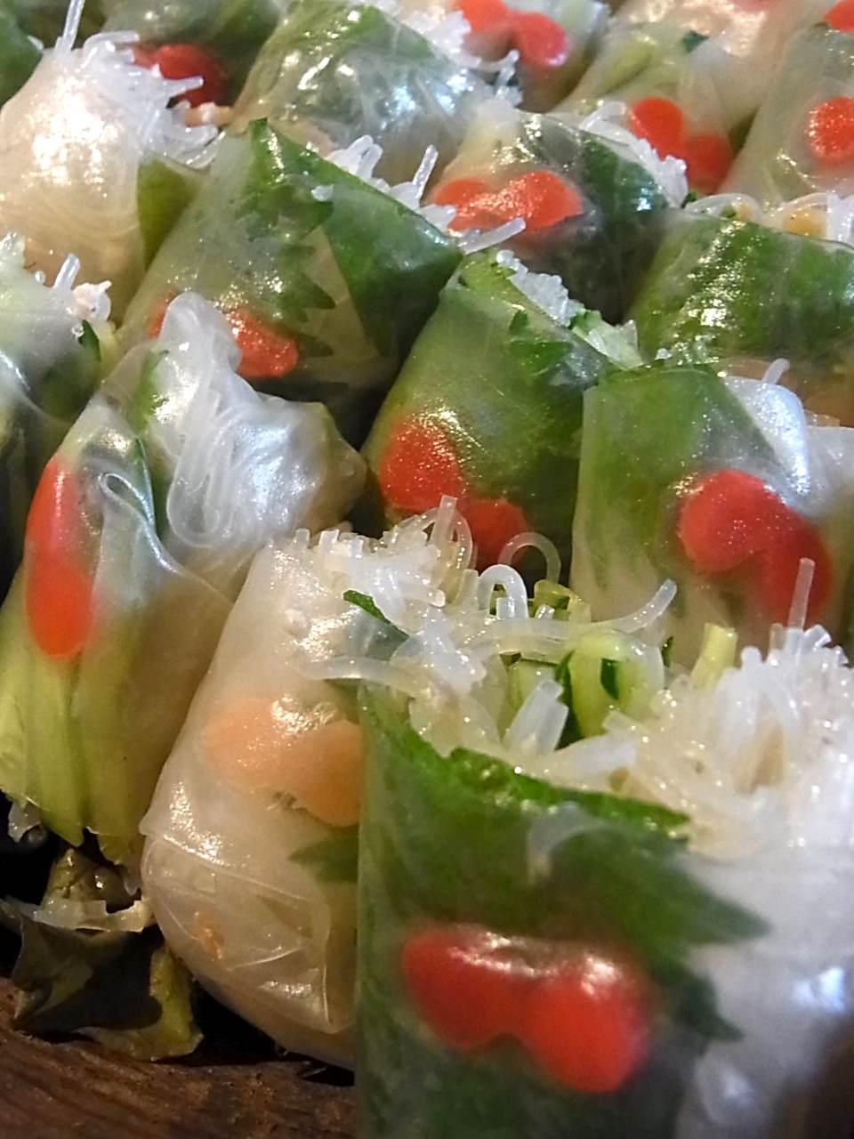 生春巻きの海に蝶を飛ばしてみたり。実はこの蝶、野菜の型抜きをステンレスで自作。