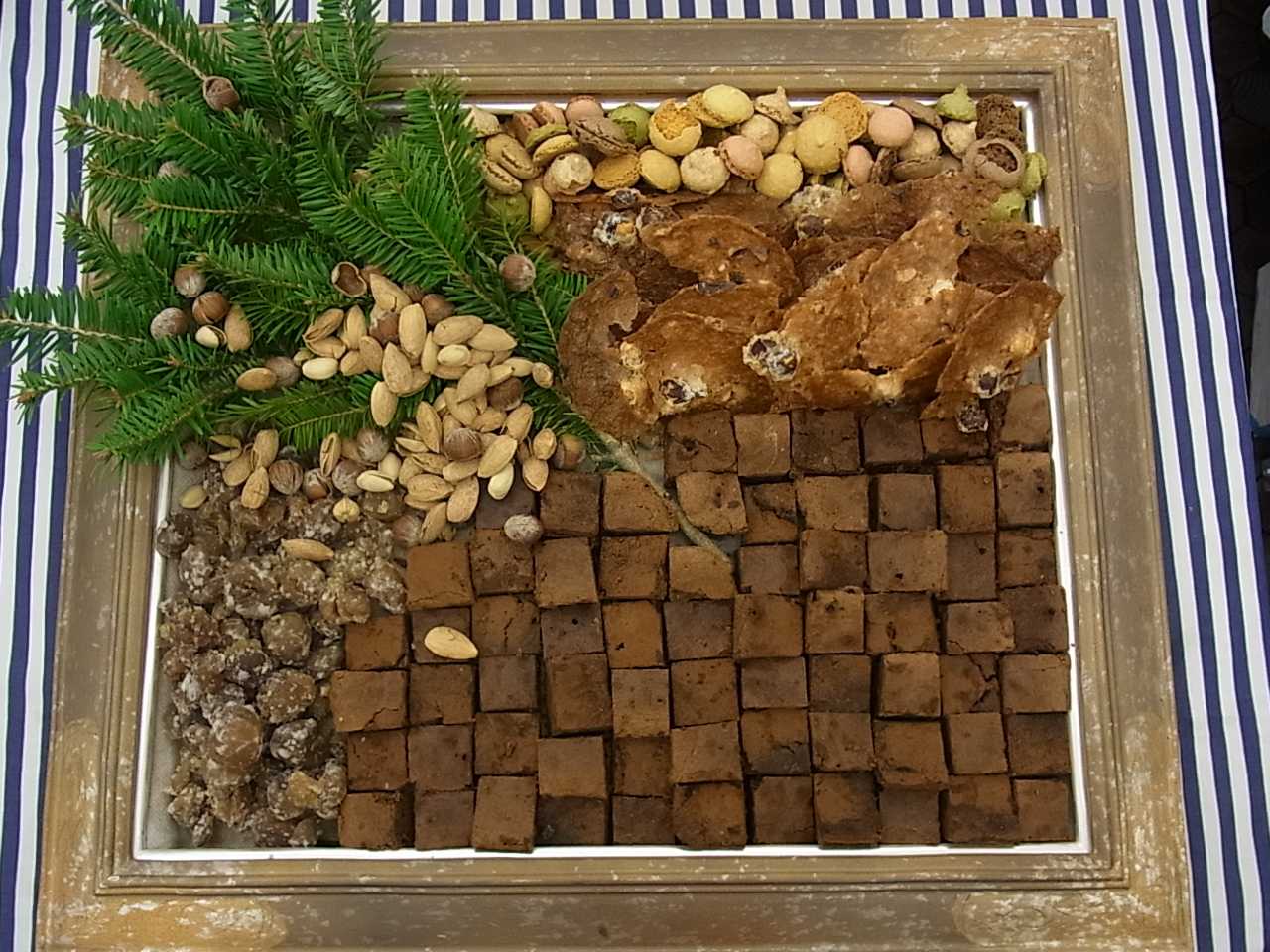 大きな額縁の中には、森に在る色をイメージした焼き菓子、木の実でできた一枚の絵。