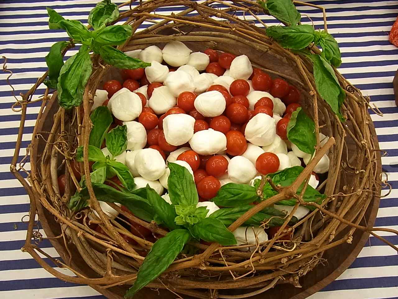 去年とり置いていた葡萄と藤の蔓も役立つ。鳥の小屋のようにと巣をつくりカプレーゼを盛る。