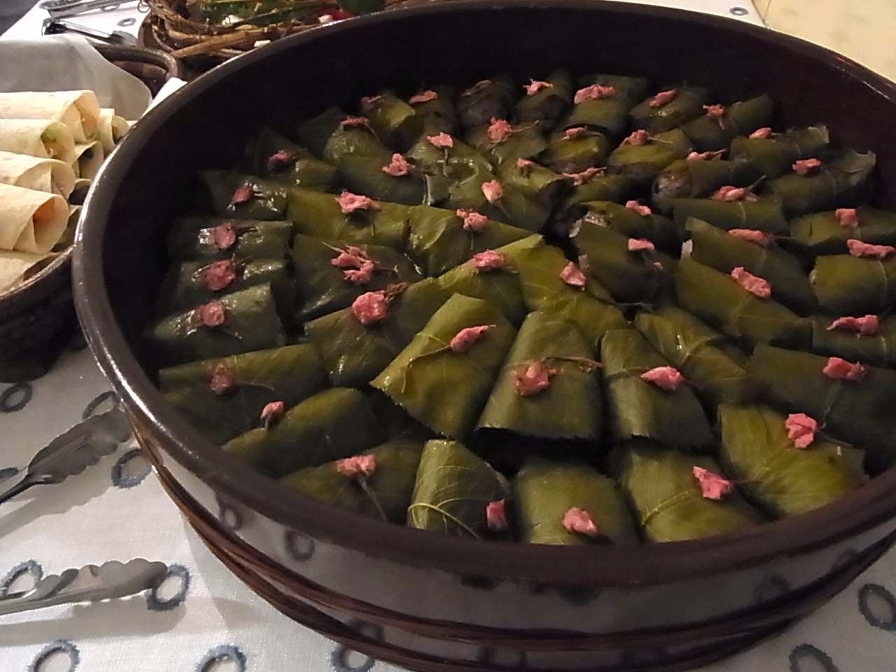 そして桜の季節らしく、お花見気分の、でも、甘くないおこわ。葉っぱの下は雑穀ともち米、赤しそ。