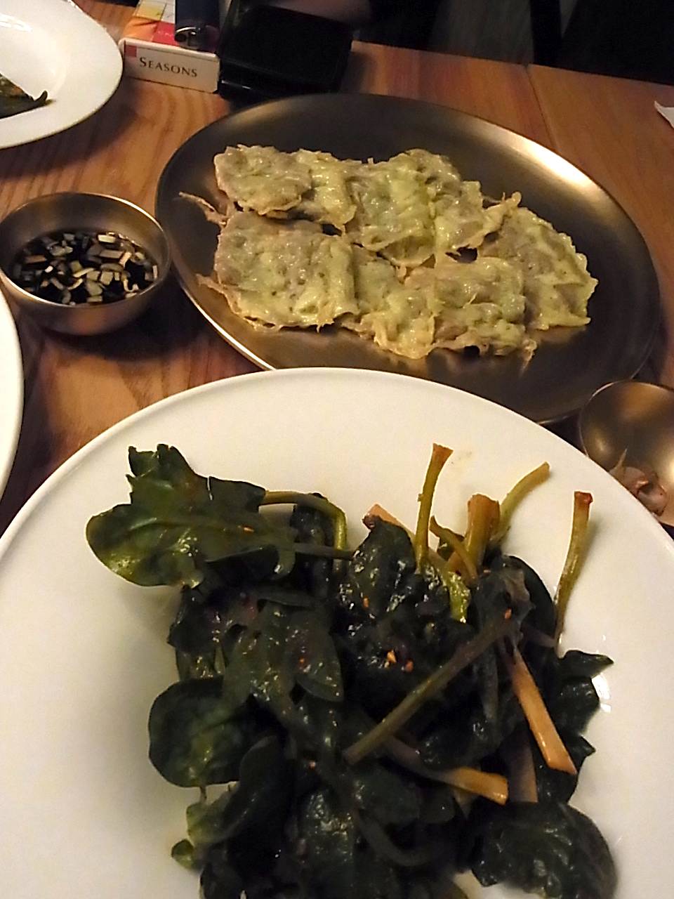 手前はルコラのサラダ韓国風、奥は牛肉のチヂミ