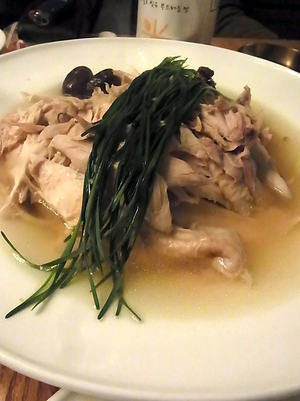 この店のスペシャル、茹で鶏。「サムゲタン?」って聞いてみたらこれは茹で鶏だと。ナツメとショウガとニンニク、うすい塩味で身もふっくらジューシー。マシッソヨ!