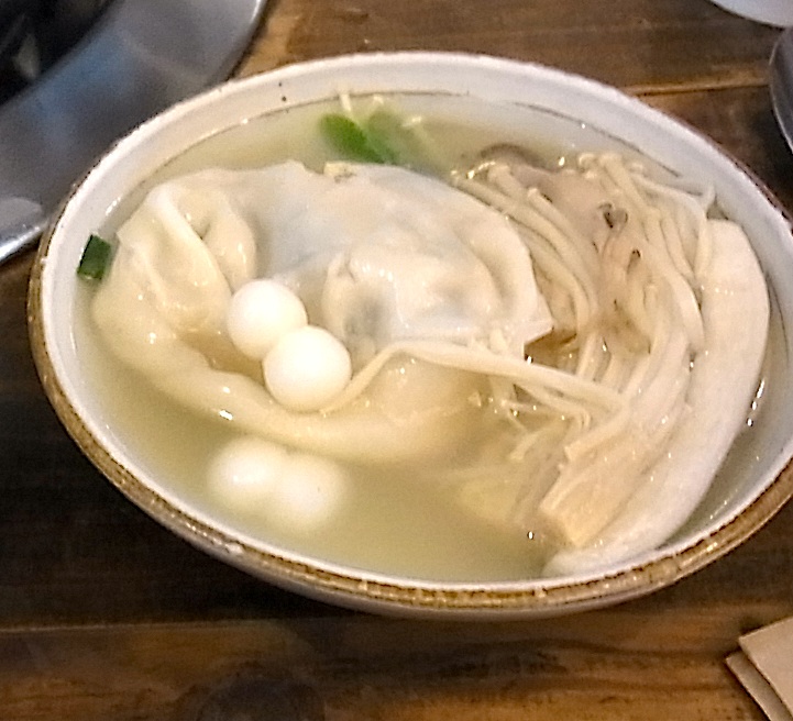 「オー!」餃子がでかい、大人の握りこぶしぐらいはある。ネギ、キノコ、筍、唐辛子がゆらゆら〜と、鶏と牛骨のスープの中を漂う。そこに小さな雪だるま「これ何?」ってシネちゃんに聞くとトックだとのこと。