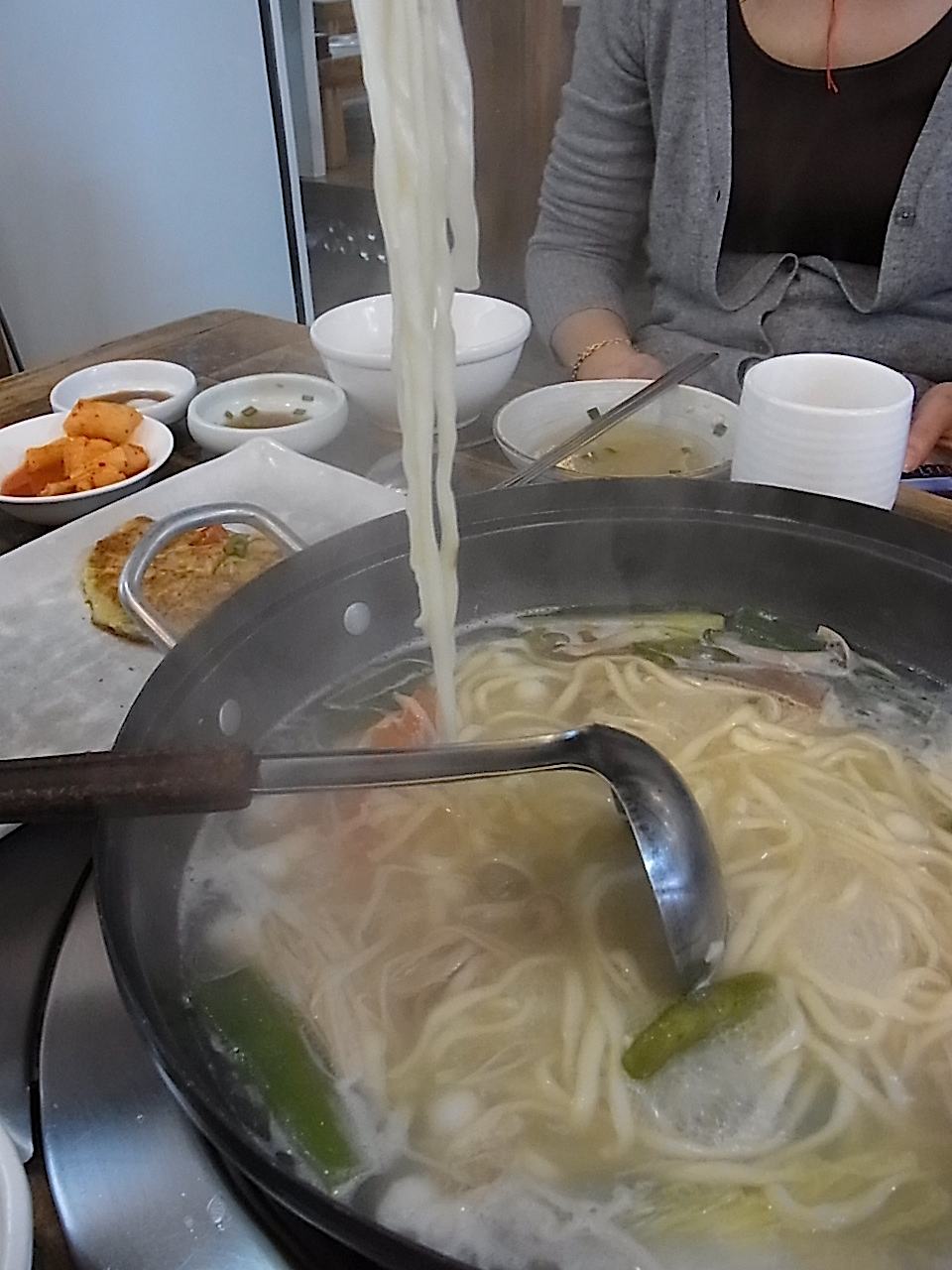 〆は手打ち麺、オモニのサービス。チヂミも食べてお腹はたんまりしてきたがこれもイケル。と、ペロリ完食。