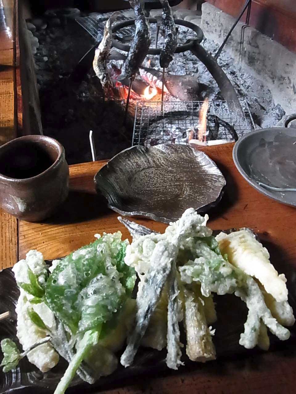 昨日も山菜攻めでしたが今日もたっぷりこれで1人前。タラノメ、コゴミ、コシアブラ、ウルイ、イタドリ、ハチク、ノビル、筍と盛りも多めの盛りだくさん。イワナがちりちりと到着時間に合わせて焼き始められいた。