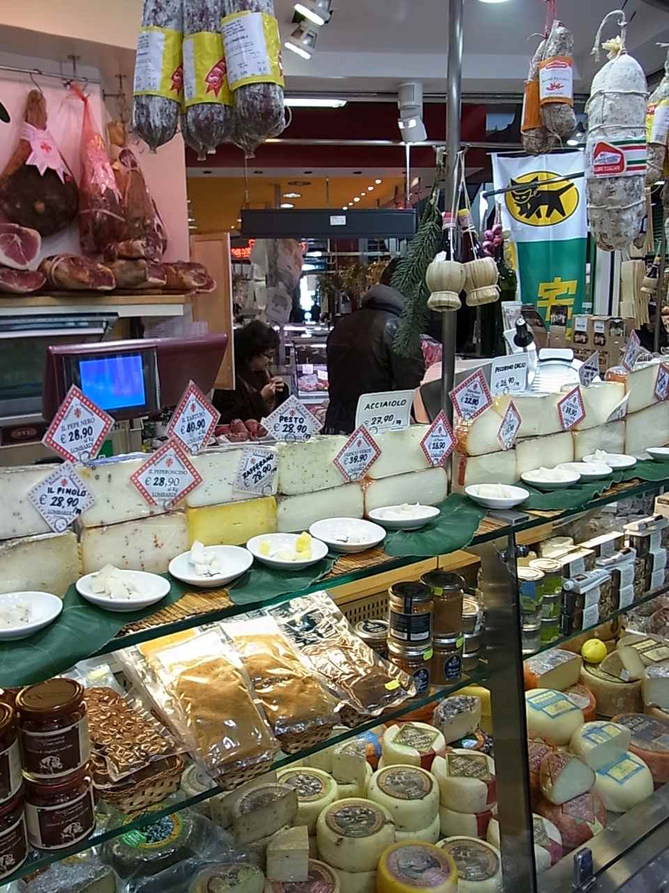 チーズの向こうに黒猫ののぼりが。この中央市場は京都の錦市場のようで、観光客が多く店員さんも英語は普通。日本人スタッフのいるお店もちらほらあり、海外発送も頼める。なんて便利。