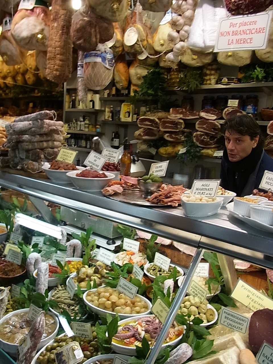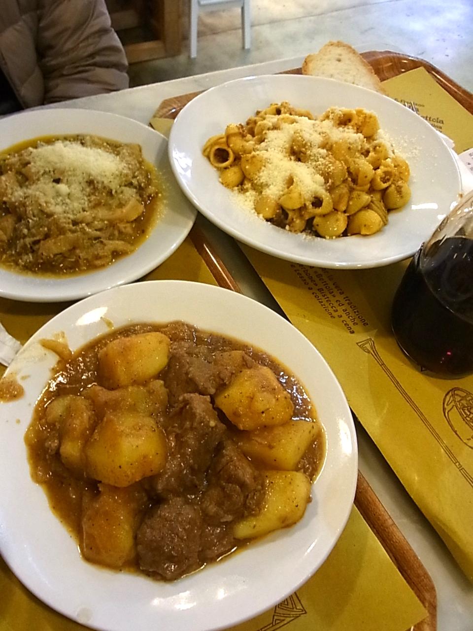 ランチは市場の食堂で頂く。寒い冬には煮込みがうれしい。牛肉とジャガイモの煮込み、ちょっとクミンのようなスパイスが入りお味は絶品!。ここのトリッパはタマネギとハーブがたっぷりでトマトが入っていない。これも美味しかった。そして貝殻の形のパスタ。