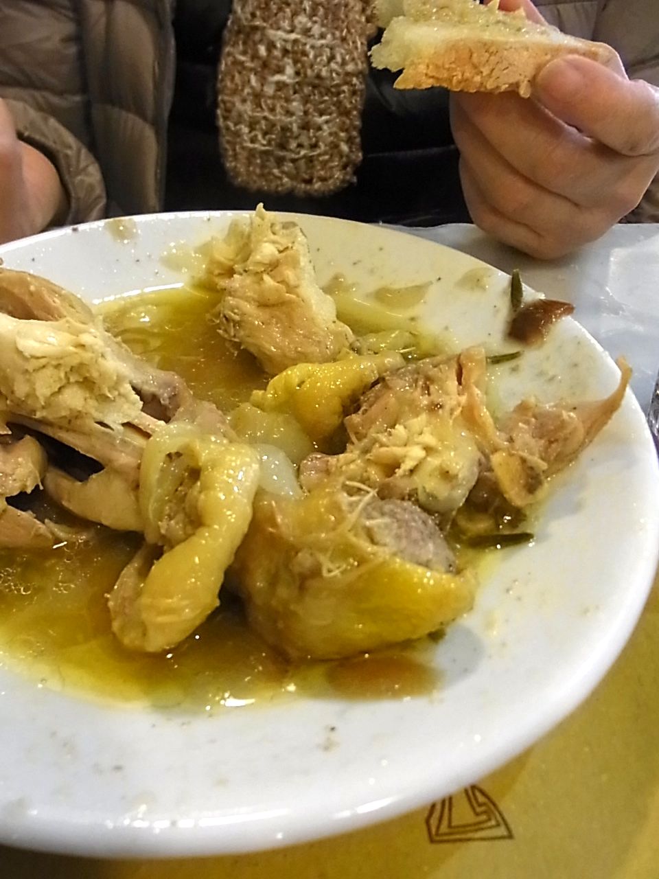 鶏と小玉葱の煮込みも滋味深い。イタリアの鶏は皮から脂身、肉までほんのり黄色い。あれは餌の色でなるんだろうか?ひね鶏くらいの身のしまったものが好まれるみたいで煮込みにするとなお美味しい。昼のワインも残らず平らげ戦利品をひっさげアパートに戻る。