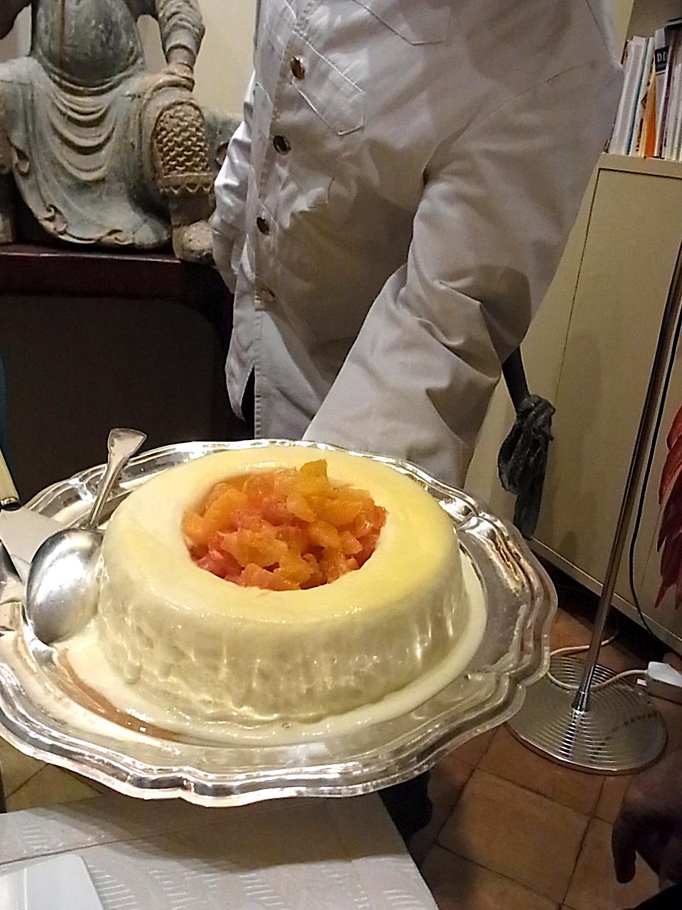 シトラスたっぷりのアイスクリームケーキ。お給仕の方がちゃんとサーブしてくれるのでレストランにいるよう。窓の下はナヴォナ広場というとんでもないロケーション、窓を開けると夜の観光の人々がこちらを見あげる。