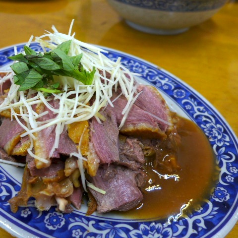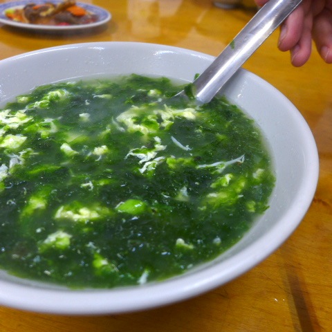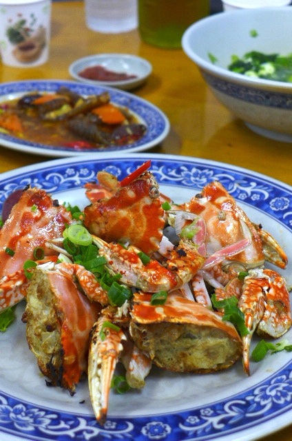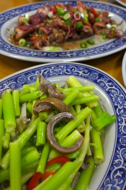 魚の腸(多分、マグロか鰹のような大型魚)と細い筍の炒め物。珍しいコンビだけどイケル。向こうは、小さなイカのイカ味噌いため。