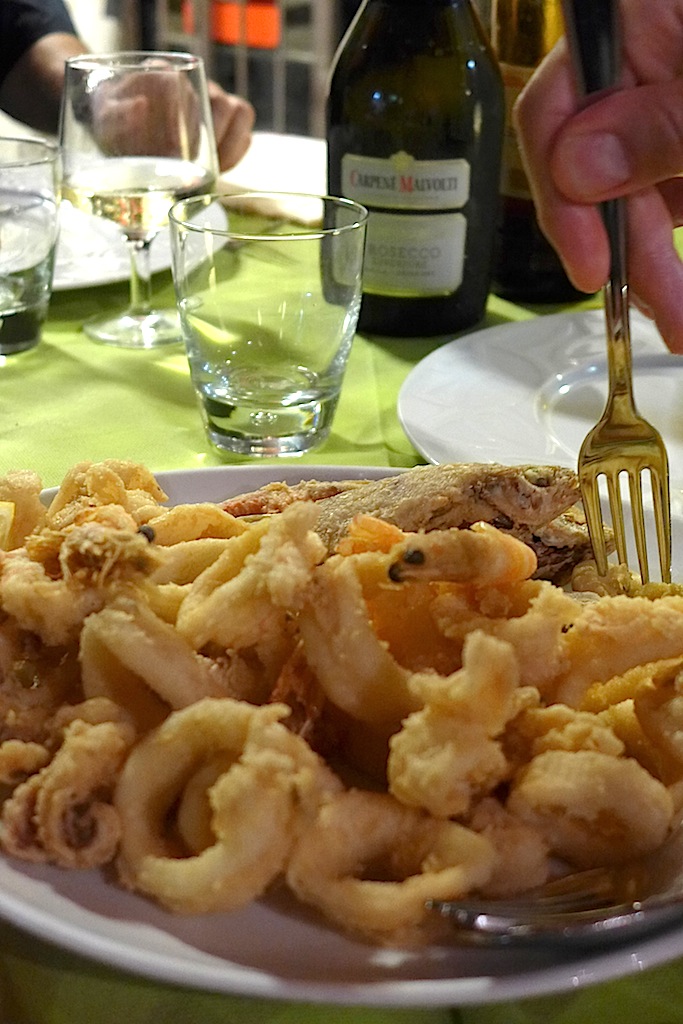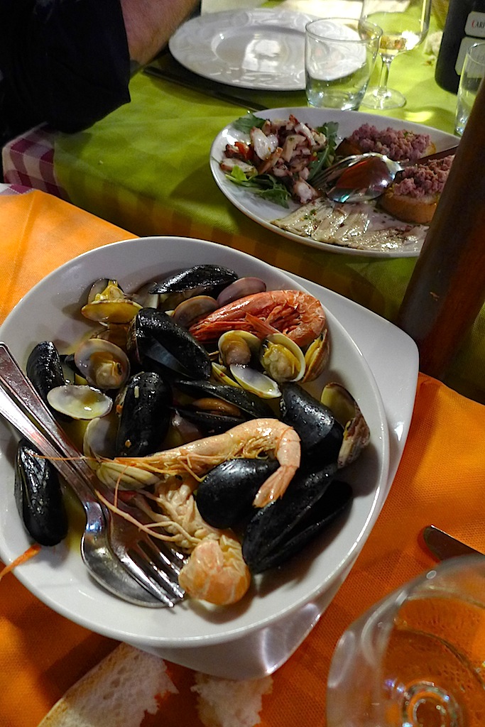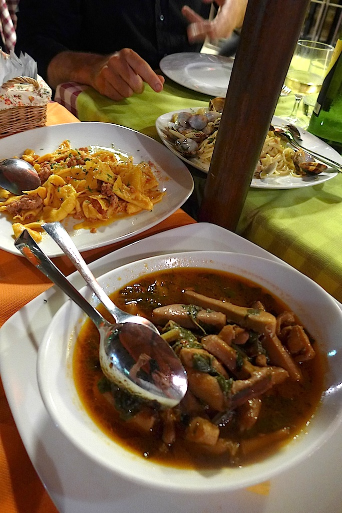 博物館でまずは勉強。それから丘の上のネクロポリへ。 円墳が立ち並ぶお墓の街。中にあったものは全部博物館に収蔵されたか、盗掘されたか。 死後の世界があると信じていたエトルリアの人々。まるで自宅の様なお墓を建て、室内を壁画で飾り、副葬品をたくさん入れた。2500年も前、豊かな文明社会がそこにあった。 その後は一路、ローマっ子の夏のリゾート地オルベッテロへ。ラグーン(干潟)、猛烈な湿気と蚊!夜の10時だというのに街はお祭り騒ぎで。 先日イタリアに帰国したばかりの友人たちと、再会を果たしディナーへ。魚介と、 魚介と、 魚介。ボロネーゼもイカミンチでできているのは初めて。
