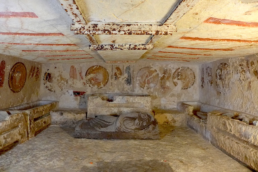 壁画の状態も鮮やかでガラス越しでもはっきり確認できる。この辺りには大量の古墳があるらしいがイタリアの文化予算にも限りあり、発掘はたいへんとのこと。もはや地層自体が文化財になるような国で、たくさんの遺跡が順番待ちになっているようだ。