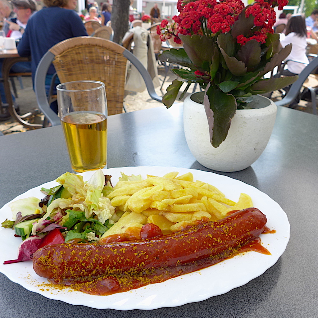 これは2日目に食べたカリーブルスト。トマトソースのかかったソーセージにカレー粉振りました、という名物。ビールは進む。