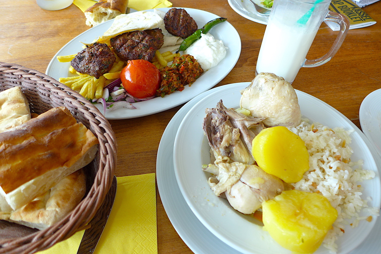 ランチに入ったトルコ料理店で久々のお米と出会う。やっぱり嬉しい。で、ついつい頼みすぎた。鳥とジャガイモの塩レモン煮込みに鳥スープで炊いたご飯添え。相方はラム肉のハンバーグ。それにトルコでは定番の塩味のヨーグルト飲料。もくもくと食べる。