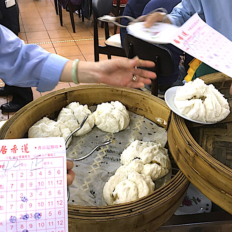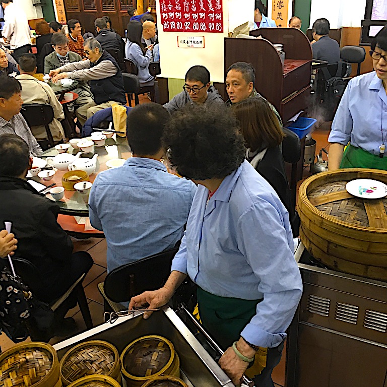 香港といえば飲茶!!讃岐の人たちの日常にうどんがあるように香港人に点心は欠かせません。夕食には決してそれを食べないところまで似ている。この日も現地の知人と待ち合わせ、入店。えー、と、その、席の案内とか、ないのね(OKと心でつぶやき)、広い店内にズケズケと分け入り、食べ終わりそうな席の横に陣取り、空くのを待つ。他にもその席を狙っている人たちがいるので、私たちの席よ!っていうのを強くアピール。